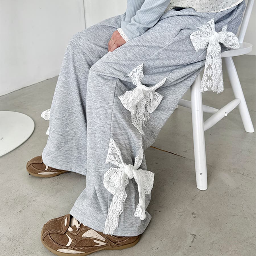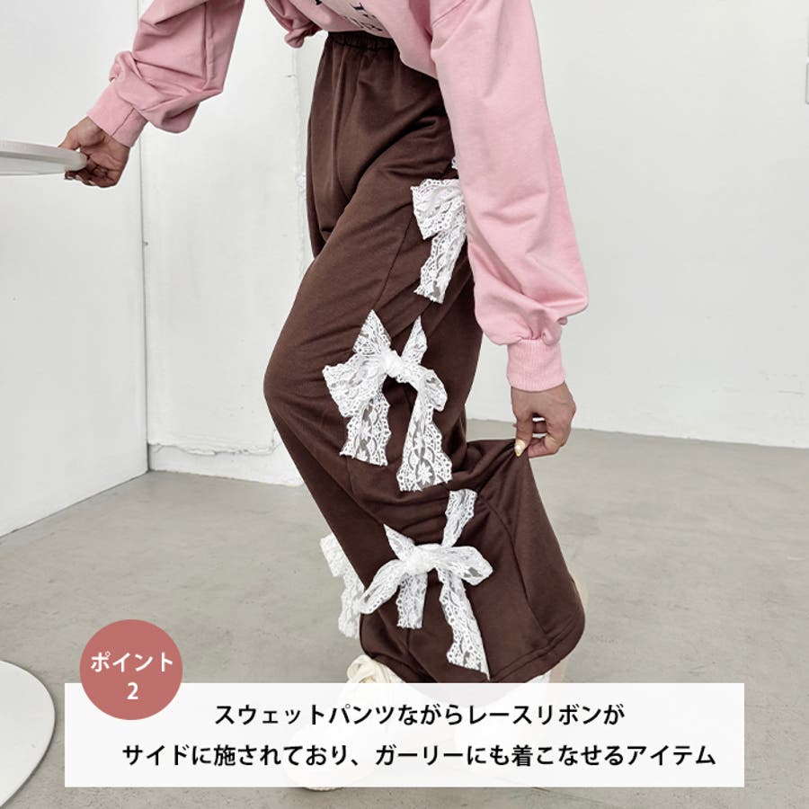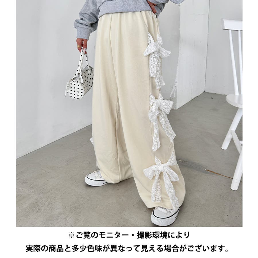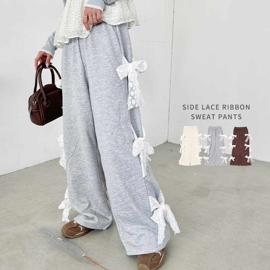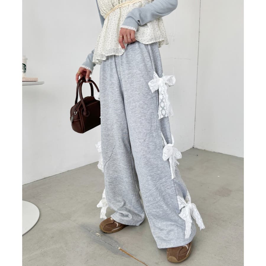 ・スウェットパンツながらレースリボンがサイドに施されており、ガーリーにも着こなせるアイテム