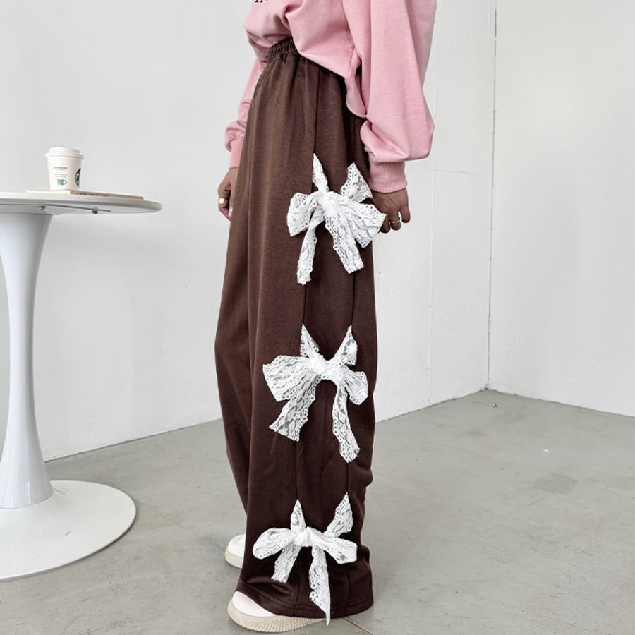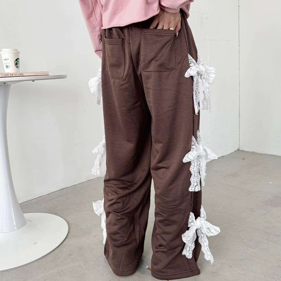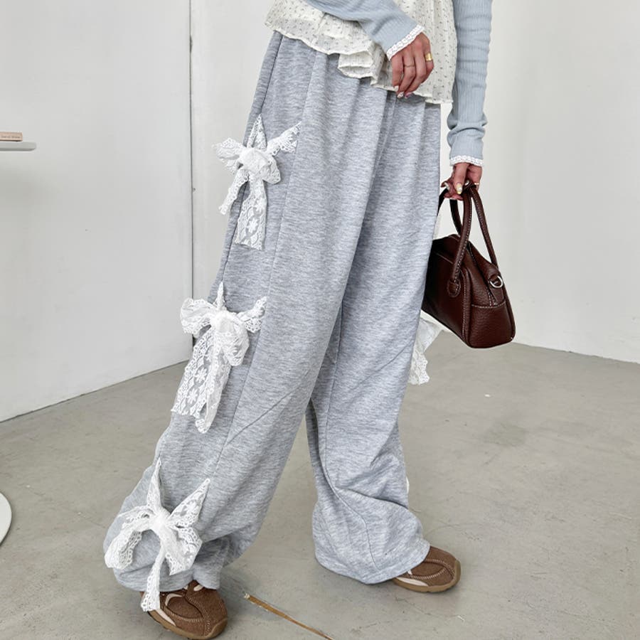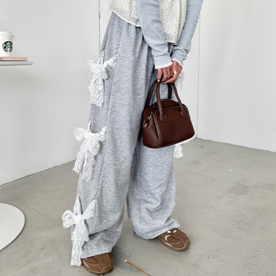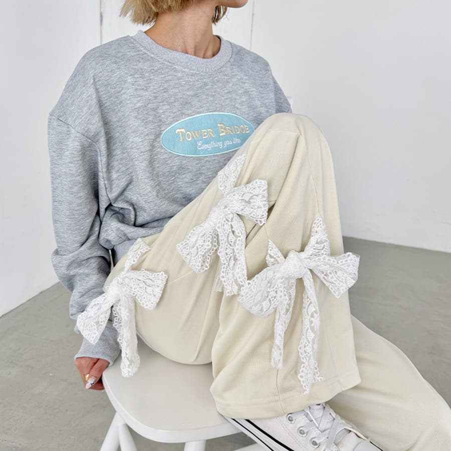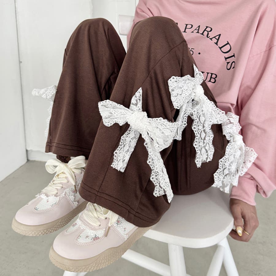 ・スウェットパンツながらレースリボンがサイドに施されており、ガーリーにも着こなせるアイテム
