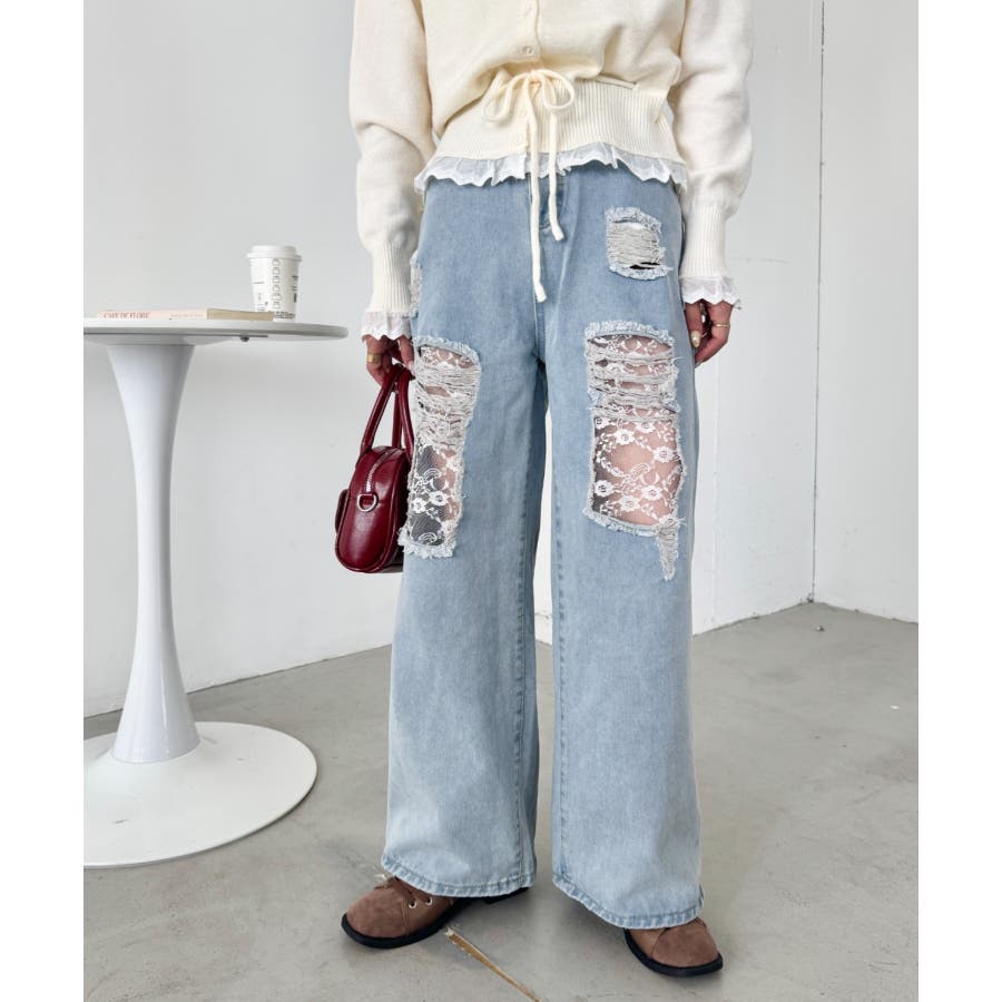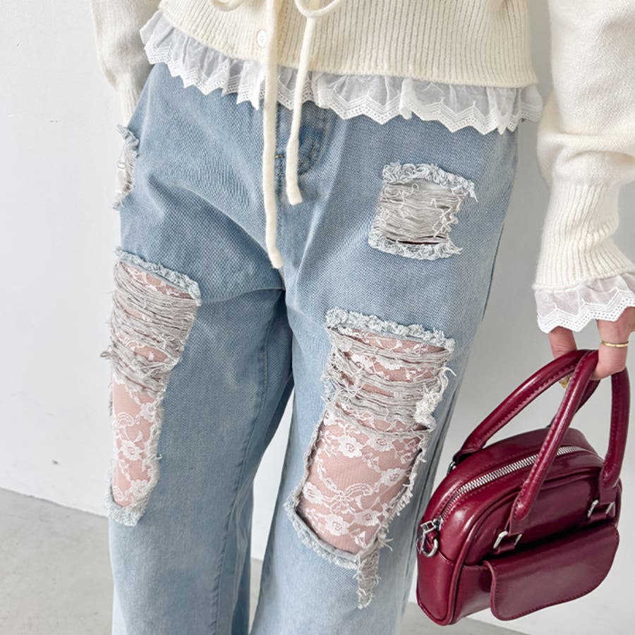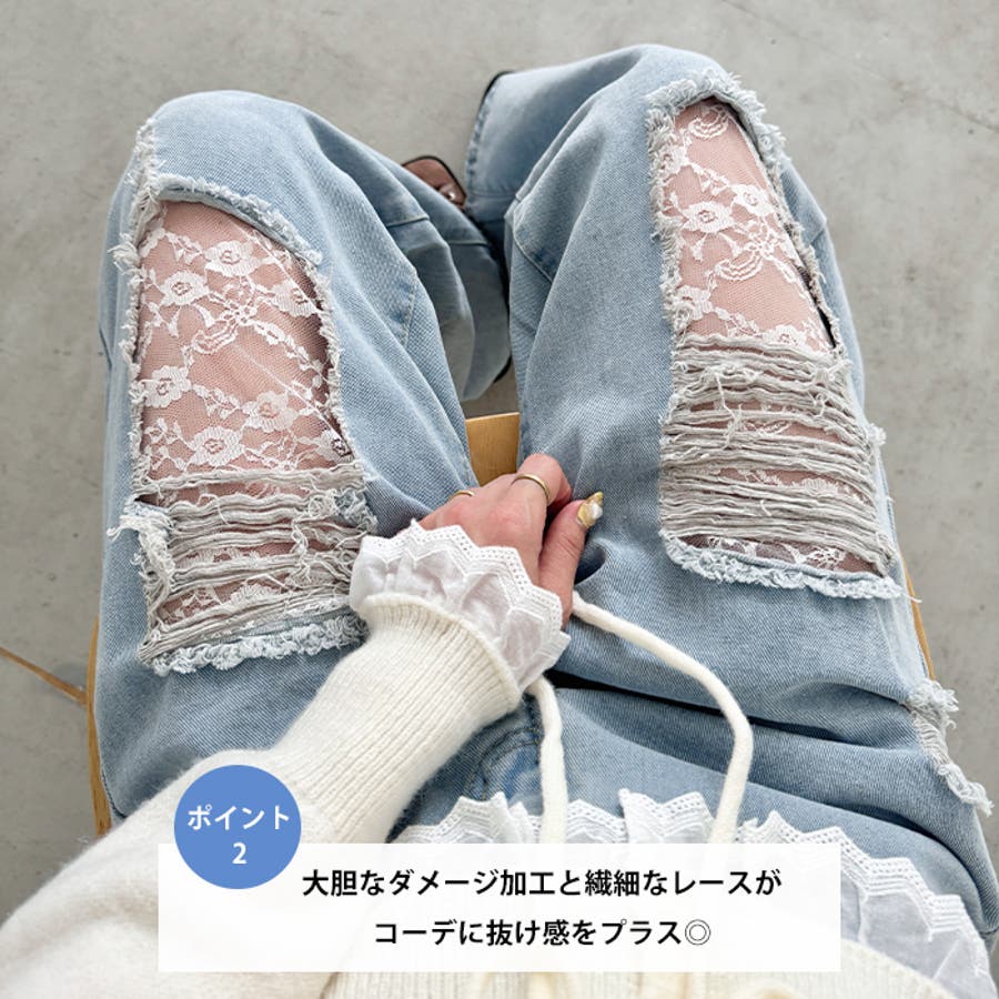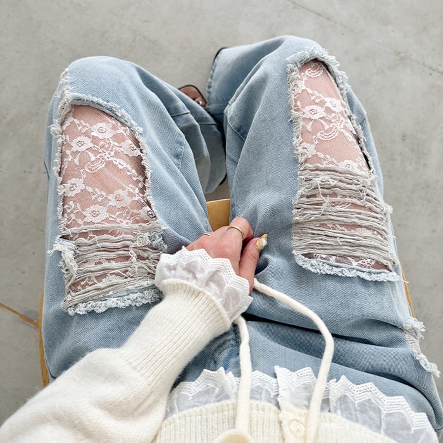 レースダメージデニムパンツ