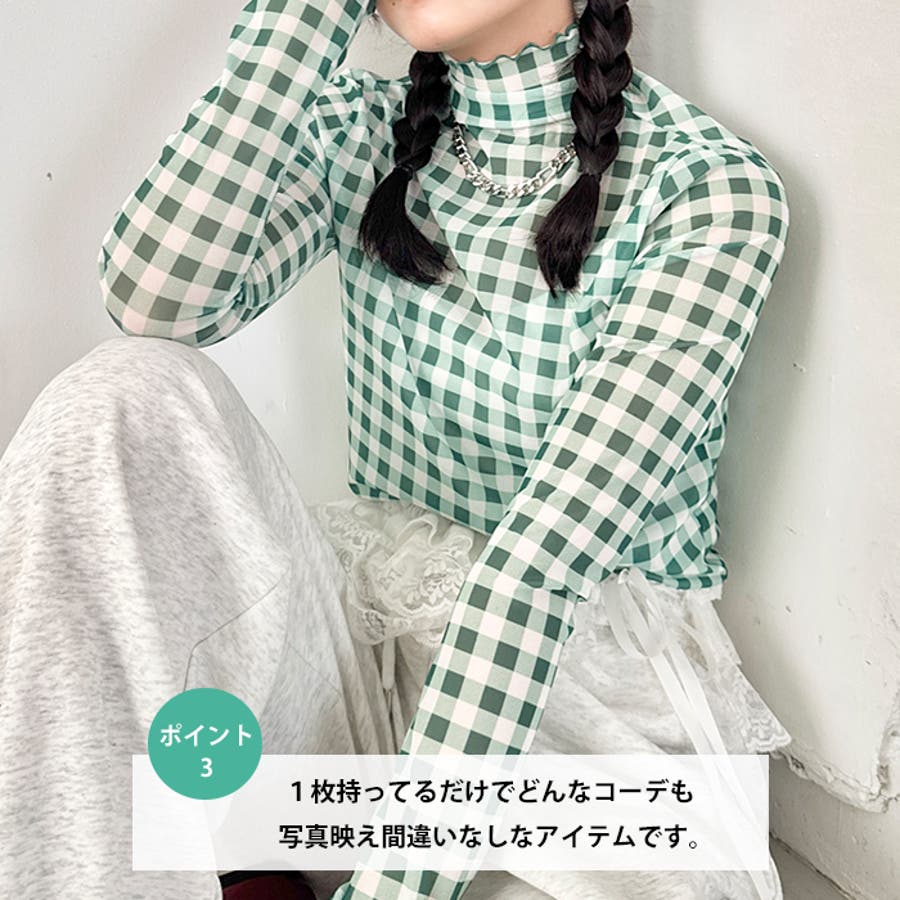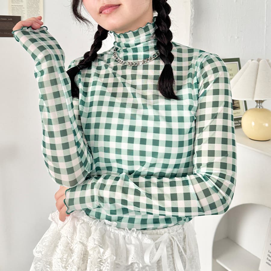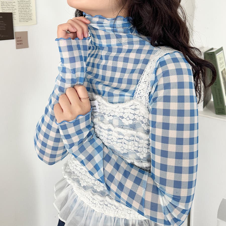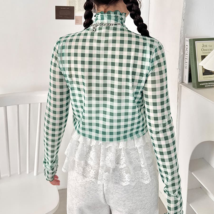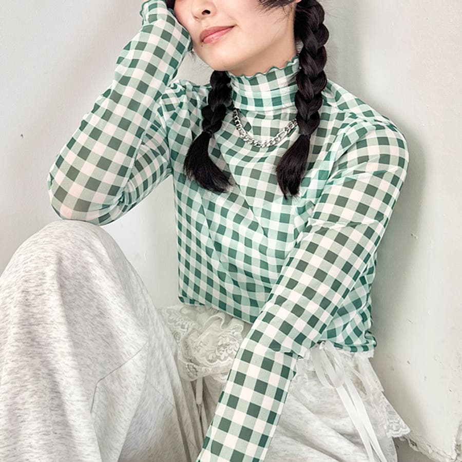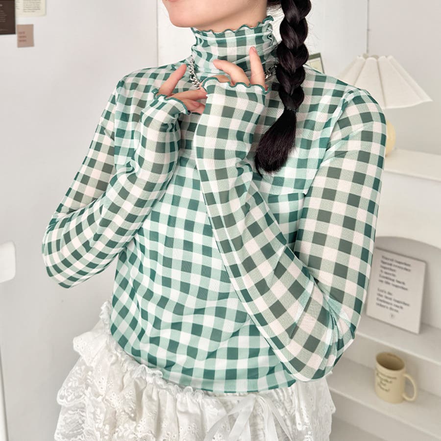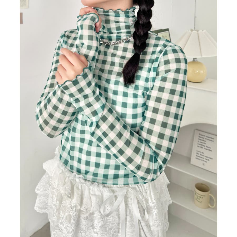ギンガムチェックシアーハイネックトップス