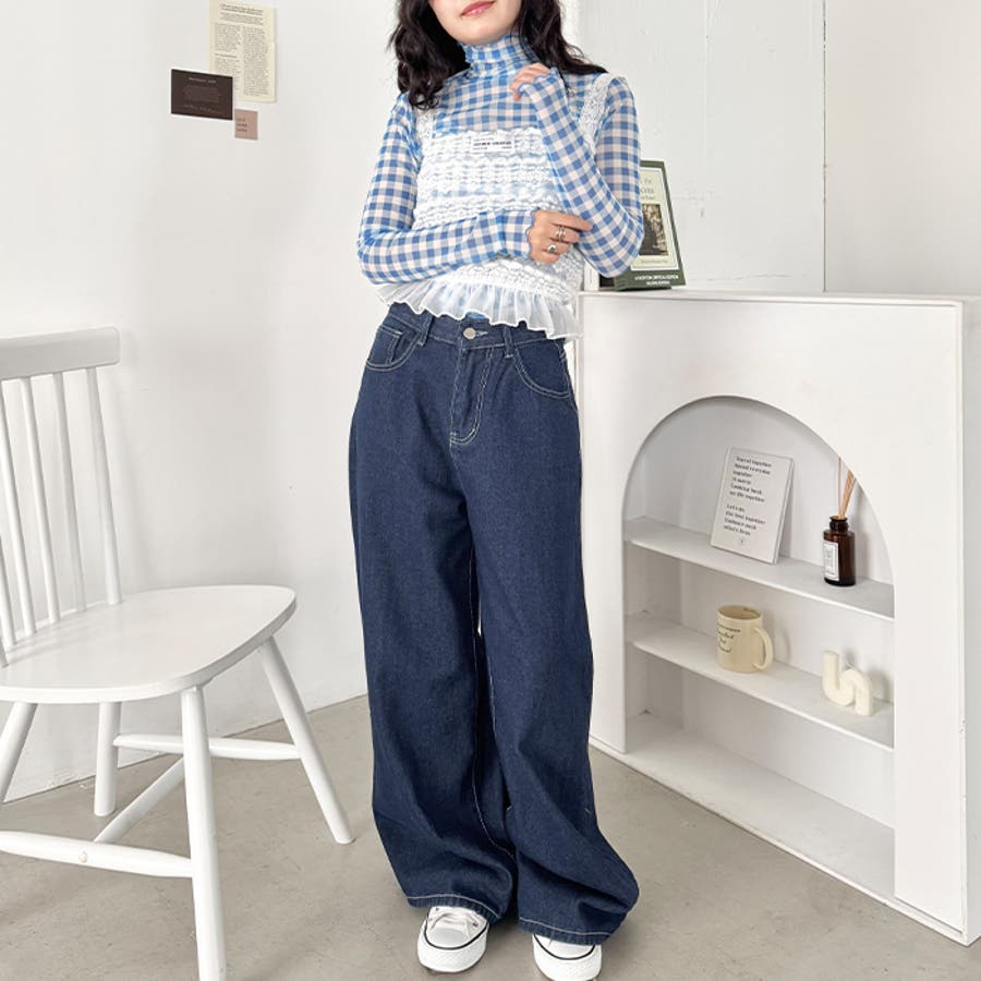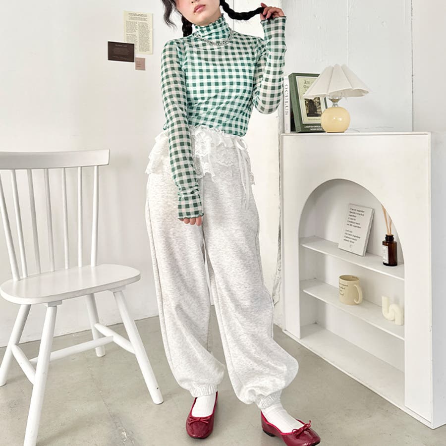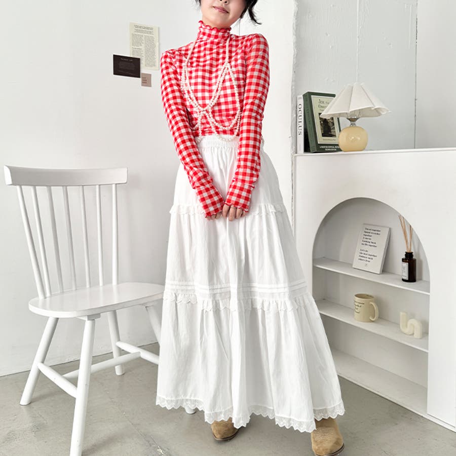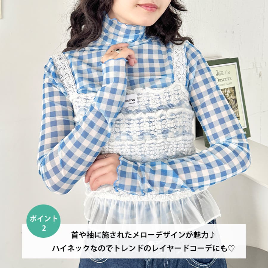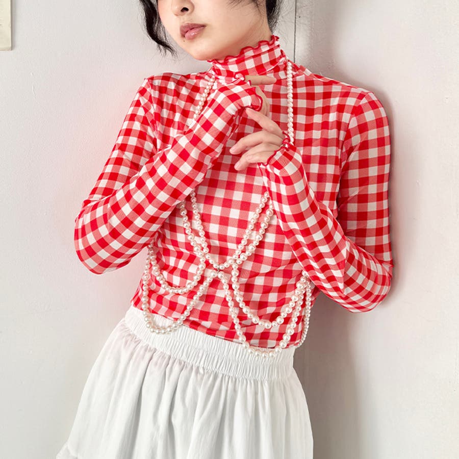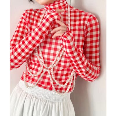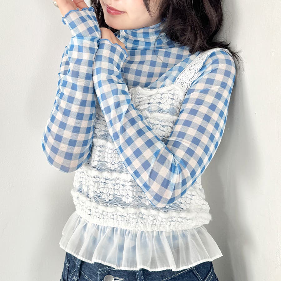 ギンガムチェックシアーハイネックトップス