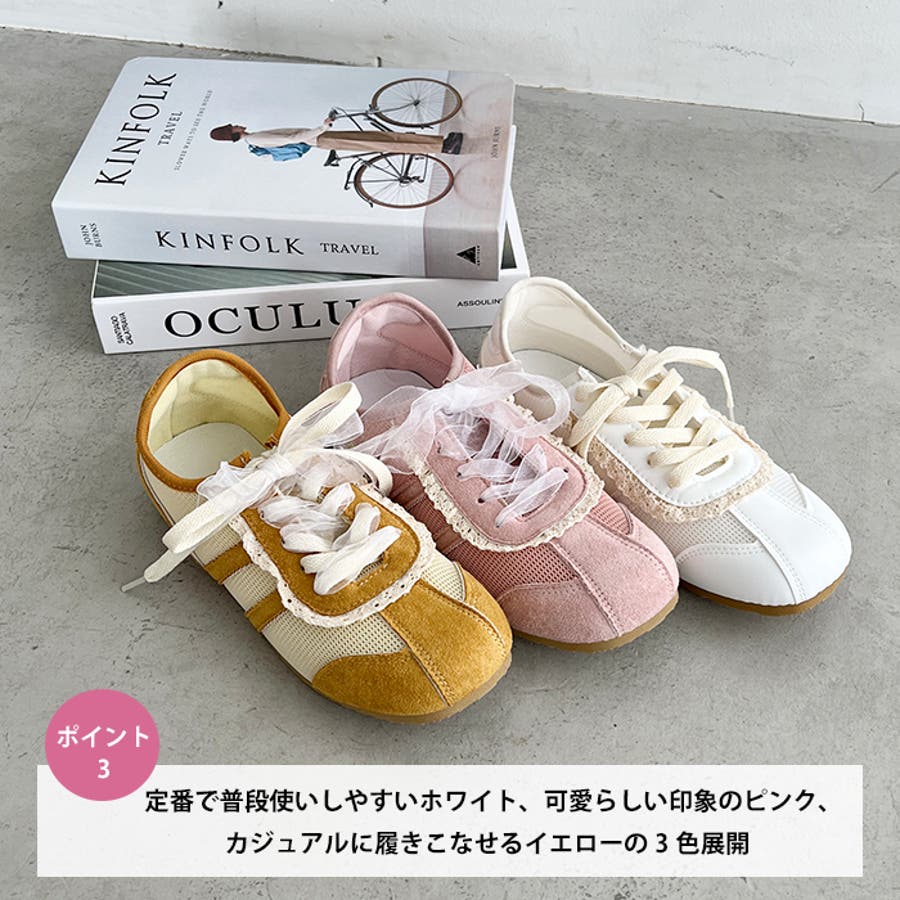 ・定番で普段使いしやすいホワイト、可愛らしい印象のピンク、カジュアルに履きこなせるイエローの3色展開