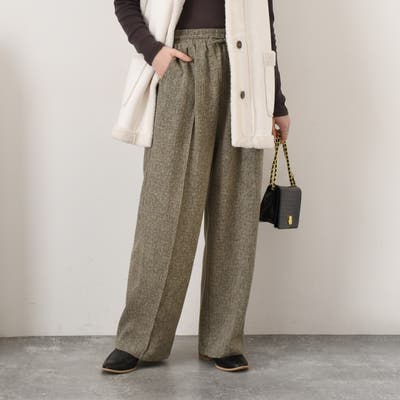 サイドポケットピンタックミックスツイードワイドパンツ レディース ボトムス 春 夏 秋 冬 薄手 ウエストゴム 裏地付き きれいめ ゆったり ハイウエスト おしゃれ オフィス OL カジュアル デイリー 通勤
