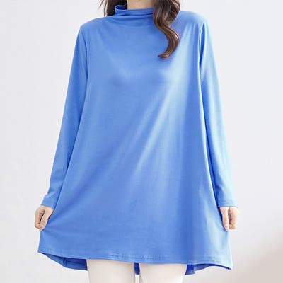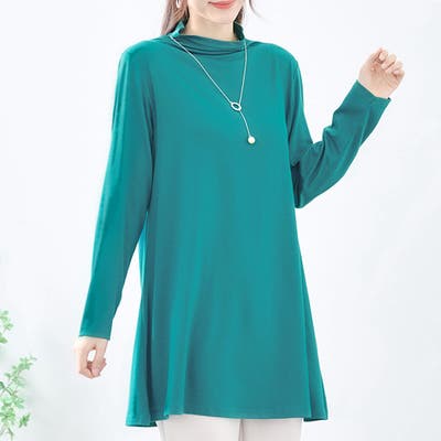 ボトルネックフレアロングストレッチカットソーチュニック レディース 長袖 きれいめ Aライン ロンT ロング丈 ゆったり 大きいサイズ 大きめ 薄手 春 トップス おしゃれ エアリー デイリー 体型カバー 婦人