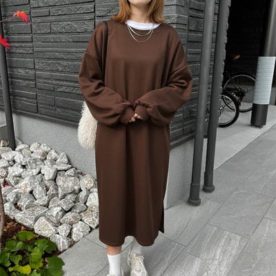 裏起毛ボリュームスリーブサイドスリットスウェットロングワンピース レディース 秋 冬 長袖 ロング丈 極暖 防寒 暖かい あったか ゆったり Iライン ストレート ワイド おしゃれ きれいめ スエット 膝下