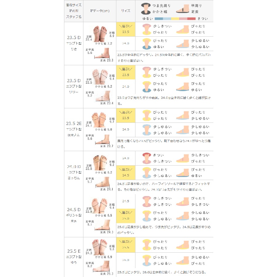 24.5は足長が緩いので、ハーフインソールで調整するとフィットする。その他はピッタリ。24.0はつま先がキツイので選ばない。