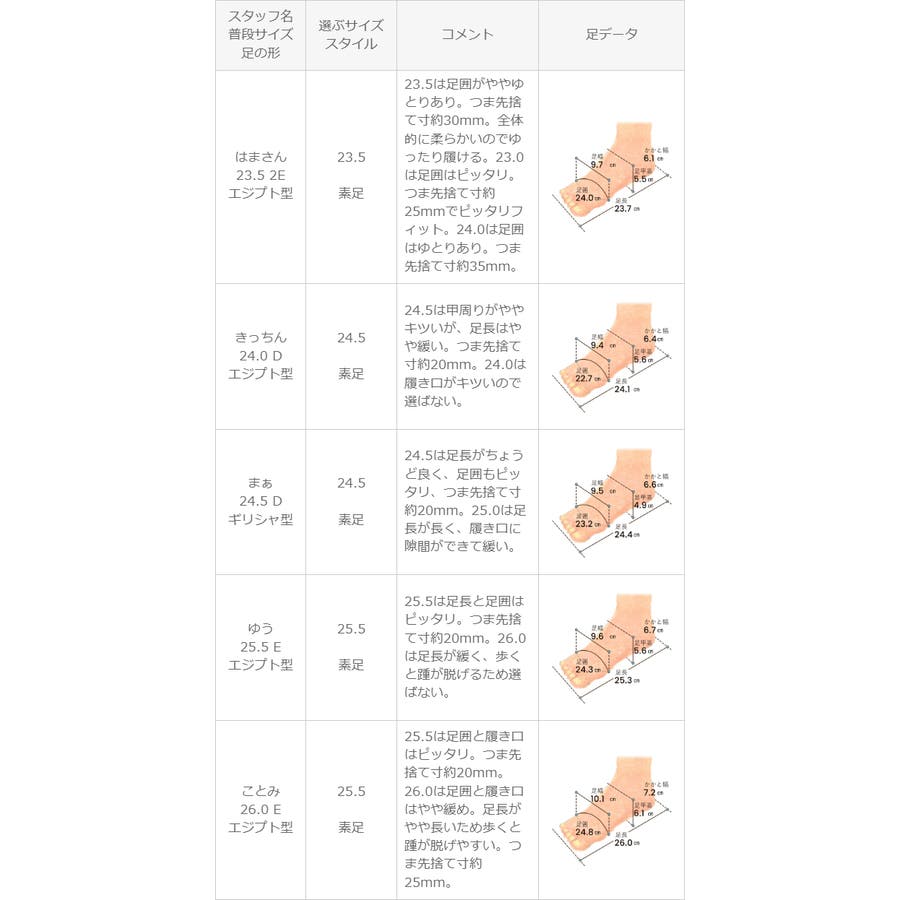 | 選ぶサイズ 23.5 | 23.5は足囲がややゆとりあり。つま先捨て寸約30mm。全体的に柔らかいのでゆったり履ける。23.0は足囲はピッタリ。つま先捨て寸約25mmでピッタリフィット。24.0は足囲はゆとりあり。つま先捨て寸約35mm。 |