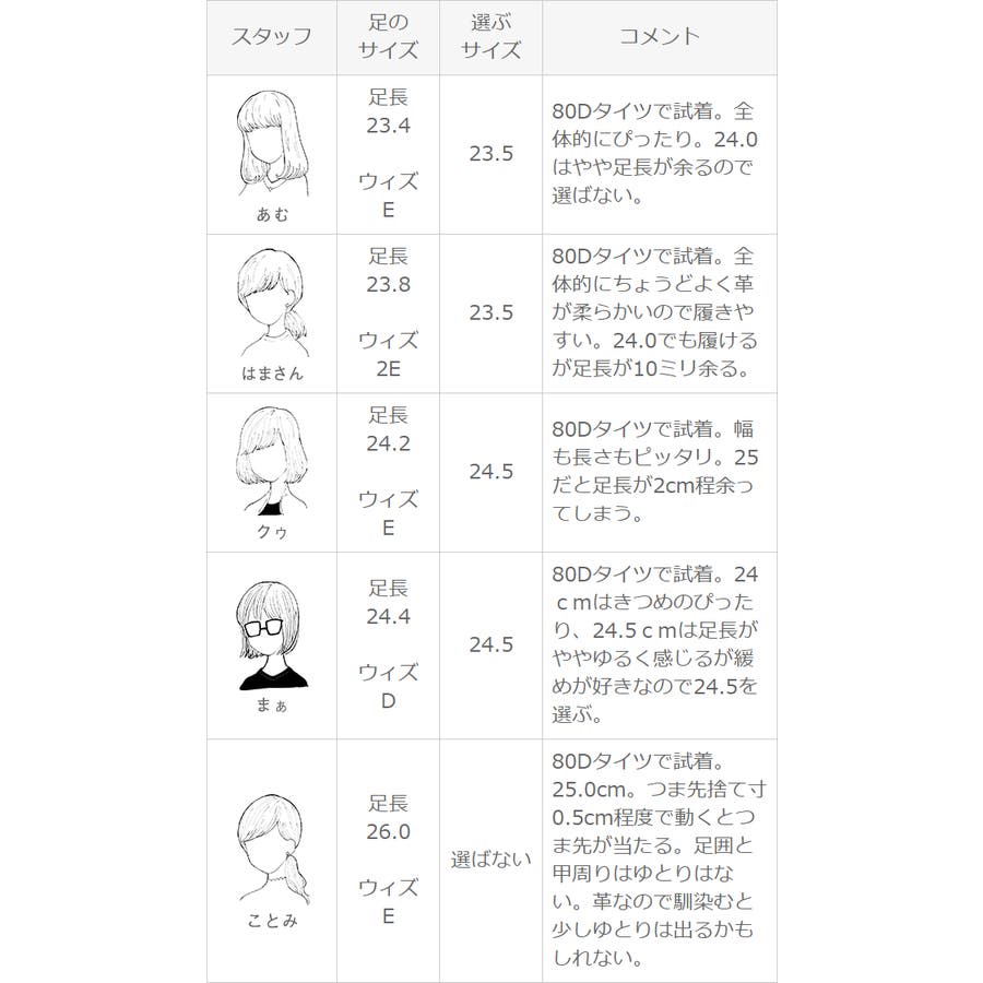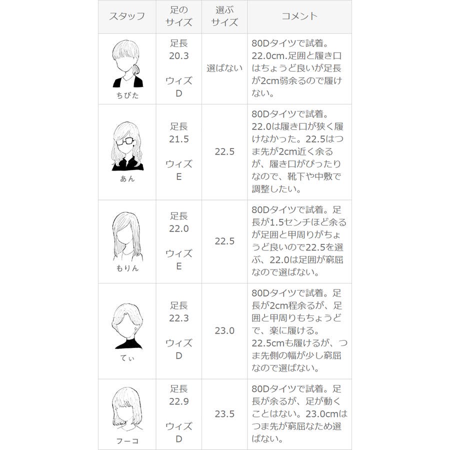 | 選ぶサイズ 23.0cm | 80Dタイツで試着。足長が2cm程余るが、足囲と甲周りもちょうどで、楽に履ける。22.5cmも履けるが、つま先側の幅が少し窮屈なので選ばない。 |