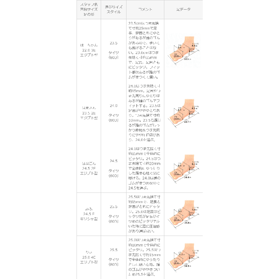 | 選ぶサイズ 24.5 | 24.0はつま先捨て寸約15mmで全体的にピッタリ。24.5はつま先捨て寸約20mmで全体的にゆったりした履き心地で楽に履ける。24.0は踵のゴムがきつめなので24.5を選ぶ。 |