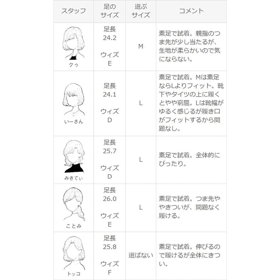| 選ぶサイズ M | 素足で試着。親指のつま先が少し当たるが、生地が柔らかいので気にならない。 |