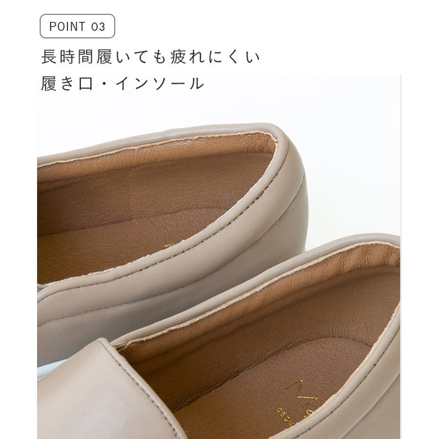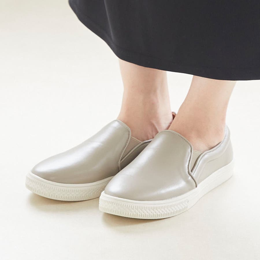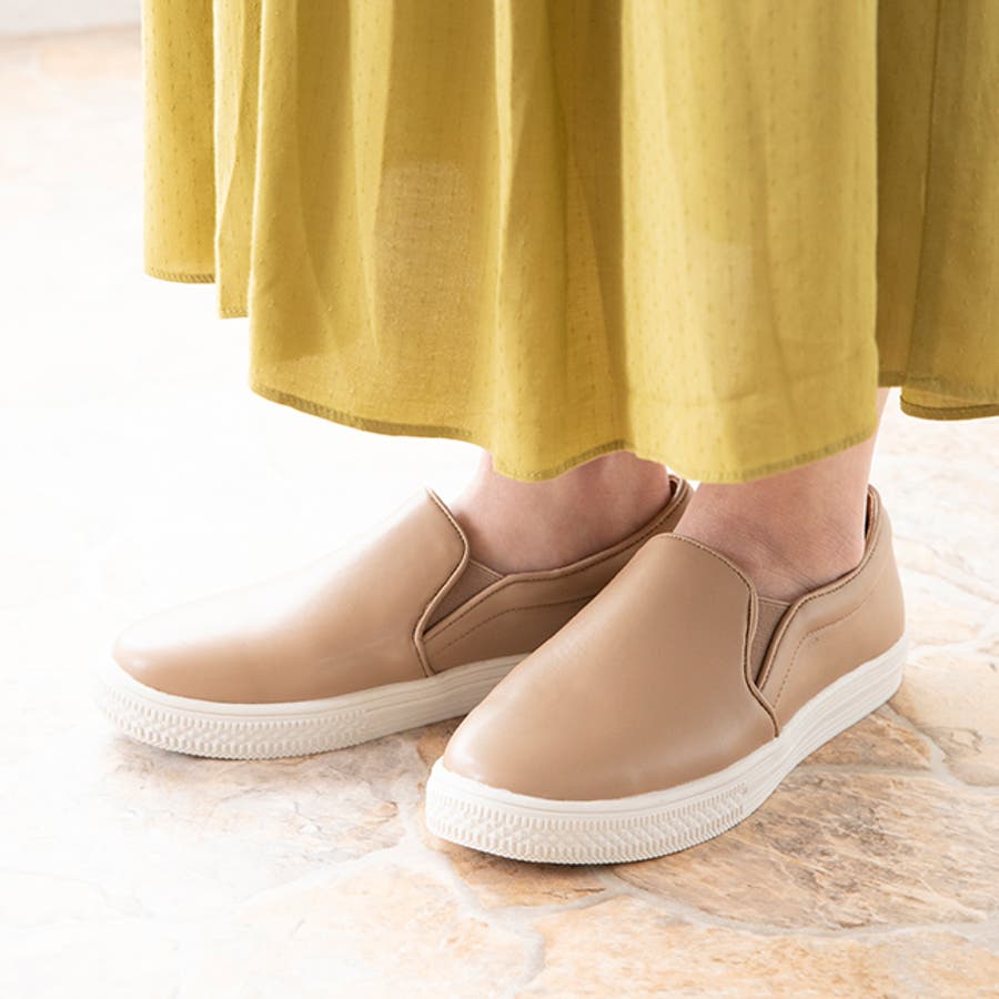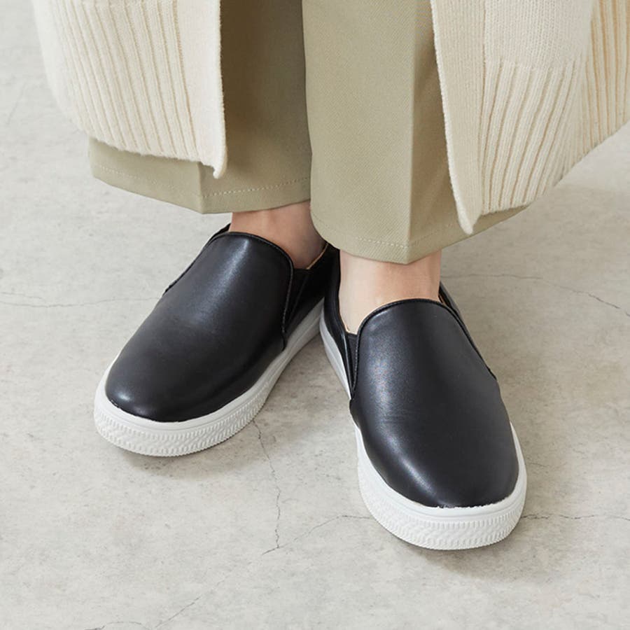 すっきりとした細身のシルエットが、足元から上質な大人カジュアルを演出するシンプルスリッポン。ふわっふわなインソールクッションは長時間履いてもノンストレス。落ち着いたブラウンだから脱いだ後も抜け目なく上品な印象を与えてくれる。さらに、履き口のもちっとした柔らかなクッションが足当たり優しくフィット。滑りにくい合成ゴムのアウトソールはクッション性が高く、足にかかる負担を軽減しスムーズな歩行をサポートするのも嬉しいポイント。甲深だけど両サイドにゴムがあるから脱ぎ履きしやすく、忙しい朝にも助かるアイテム。歩きやすさや履きやすさにこだわっているから、ちょっとしたお買い物から遠出のお出かけや旅行にも幅広く重宝します。