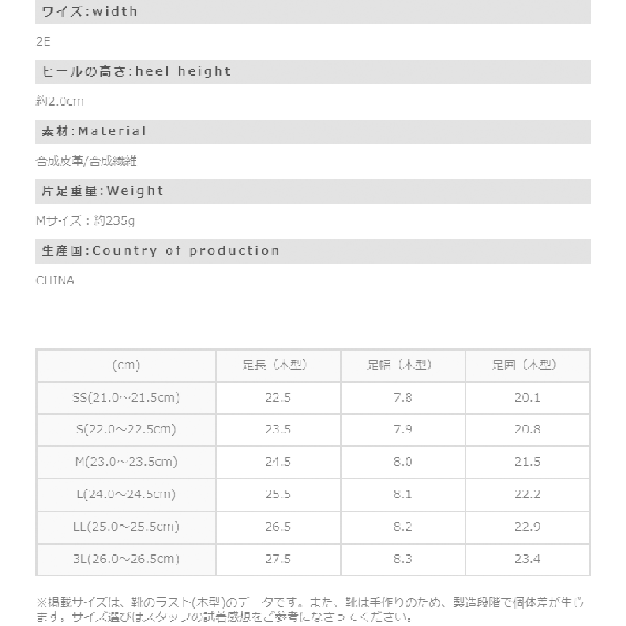 | サイズ | SS(21.0~21.5cm) / S(22.0~22.5cm) / M(23.0~23.5cm) / L(24.0~24.5cm) / LL(25.0~25.5cm) / LLL(26.0~26.5cm) |