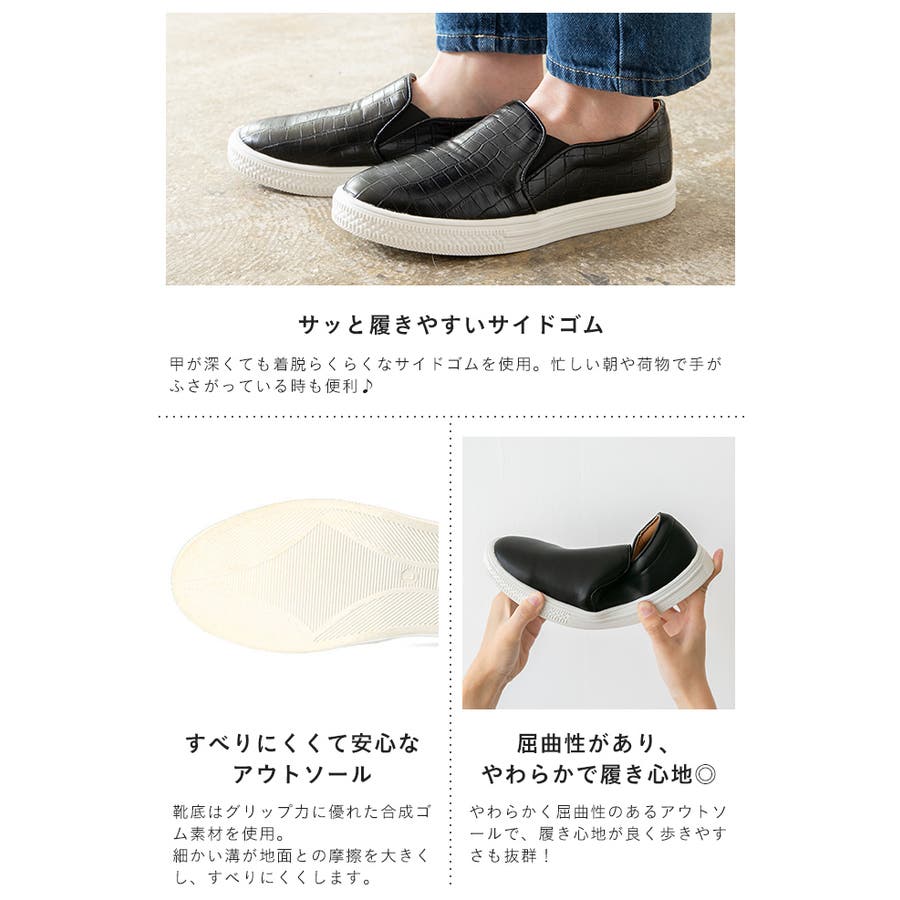 スリッポンは履き口がキツい物もあって心配でしたがこちらの商品は大丈夫でした。どんな服装にも合いそうです。さん (30代 / 女性 )購入アイテム:カラー 1037グレージュクロコpuサイズ L(24.0~24.5cm)足のサイズ:24.0cmサイズ感:ぴったり - いい感じ