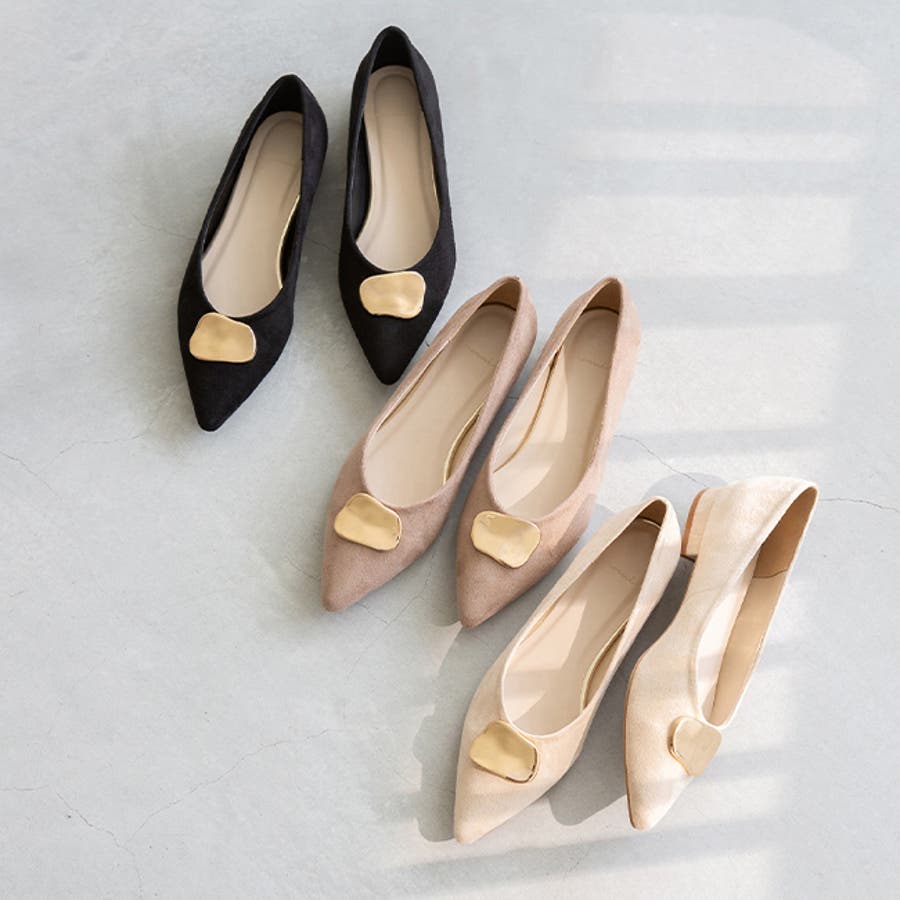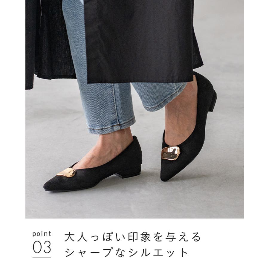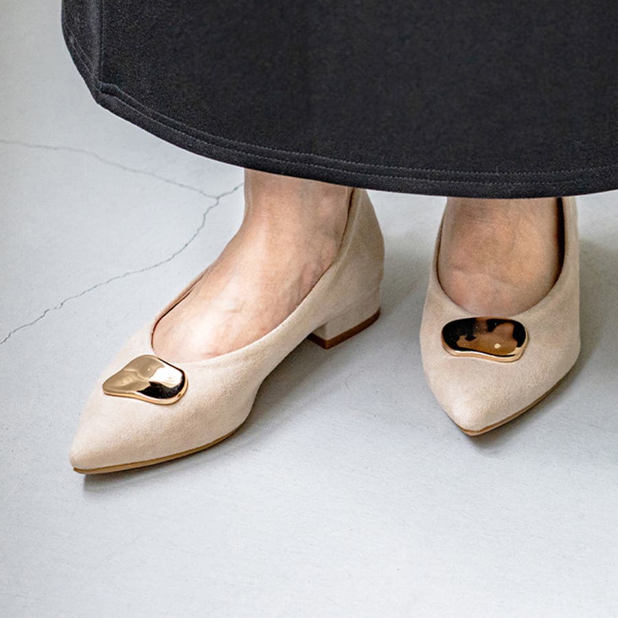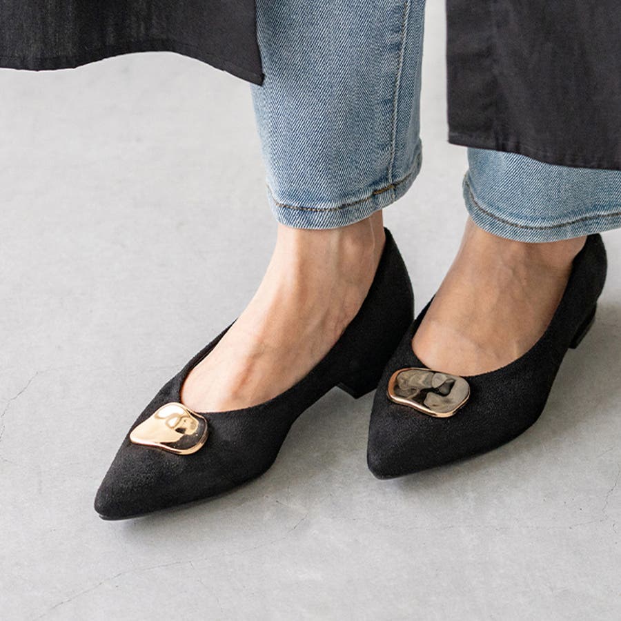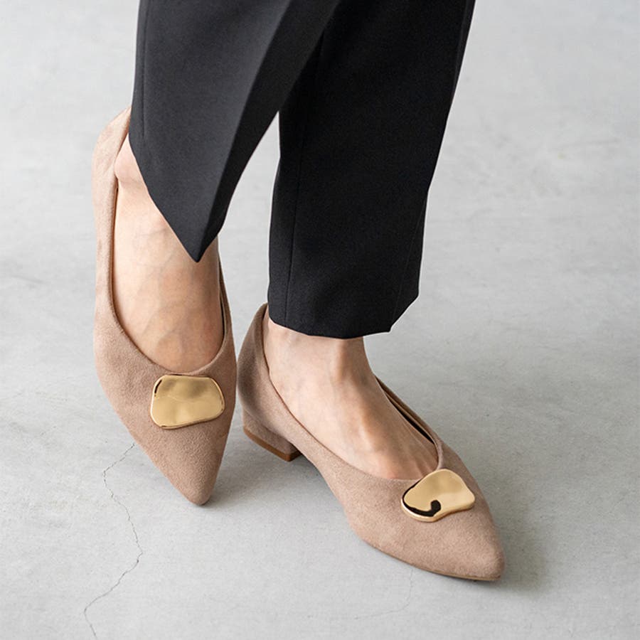 ポインテッドトゥ×ゴールドのオーナメントで一気に大人の女性らしさをアップ。