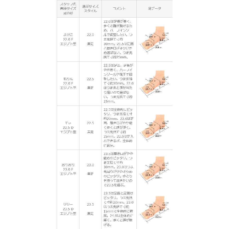 選ぶサイズ 22.5 | 22.5は足囲、足長がやや緩くハーフインソールや靴下で調整したい。つま先捨て寸約30mm。22.0はつま先と踵が当たり痛いので選ばない。つま先捨て寸約25mm。 |