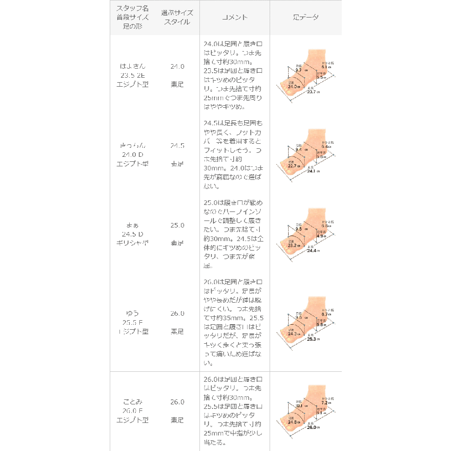 選ぶサイズ 24.5 | 24.5は足長も足囲もやや緩く、フットカバー等を着用するとフィットしそう。つま先捨て寸約30mm。24.0はつま先が窮屈なので選ばない。 |