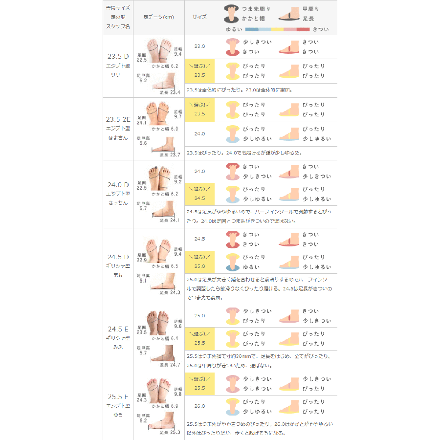 24.5は足長がややゆるいので、ハーフインソールで調節するとぴったり。24.0は足囲とつま先がきついので選ばない。