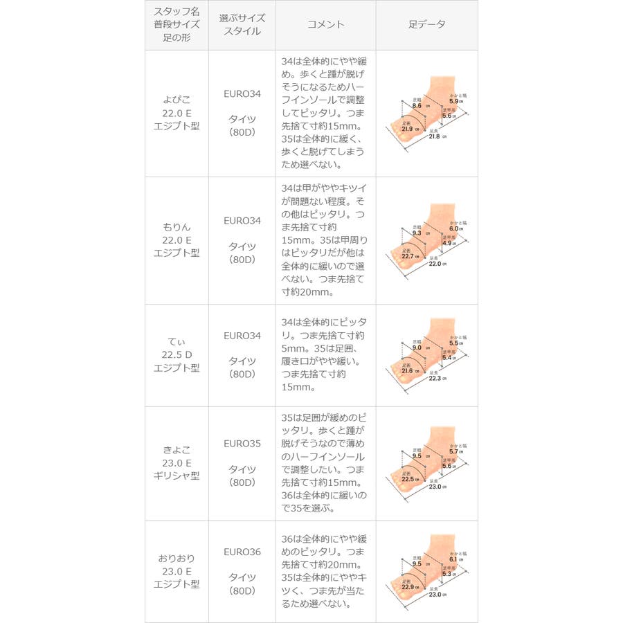 | 選ぶサイズ EURO37 | 37は足囲はややゆとりあり。つま先捨て寸約10mm。足囲が緩めだが甲が深いので脱げにくい。38は足囲にゆとりあり。つま先捨て寸約20mmで全体的に緩い。歩くとかかとが脱げる。 |