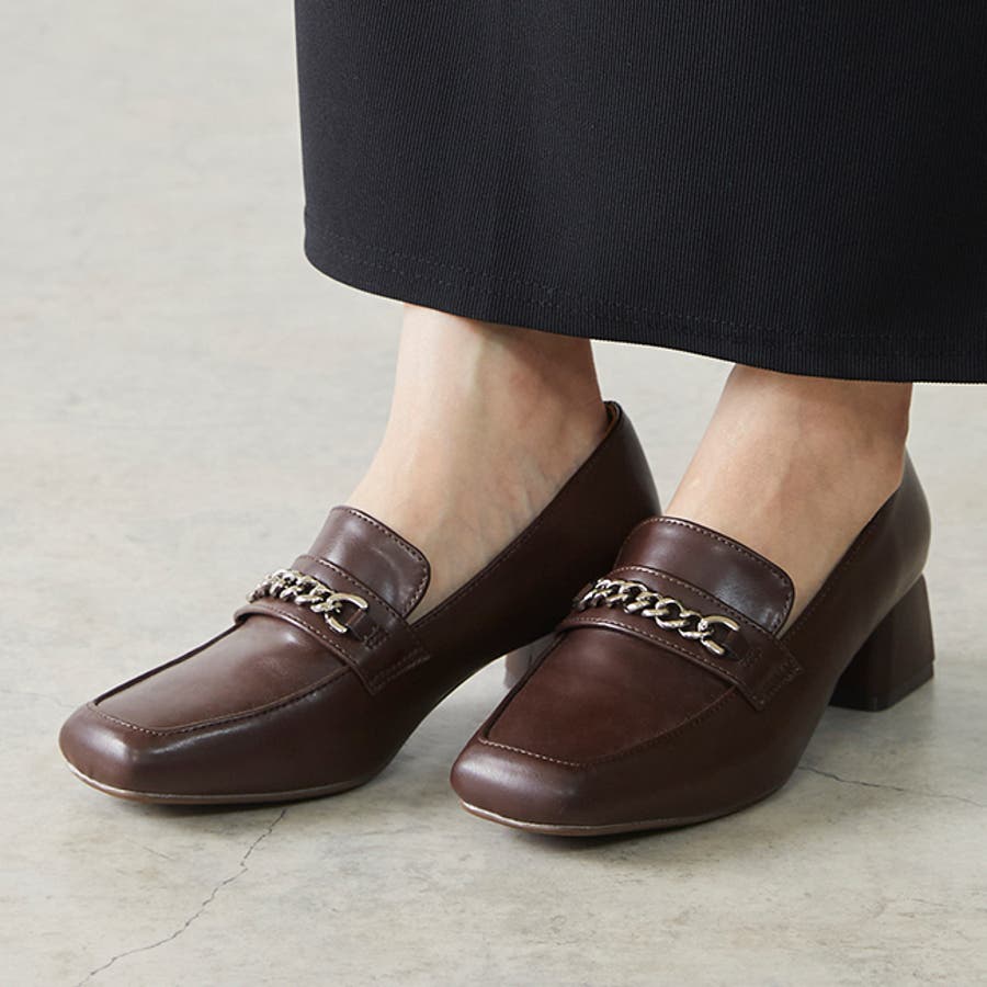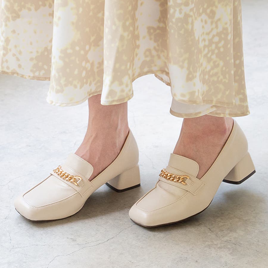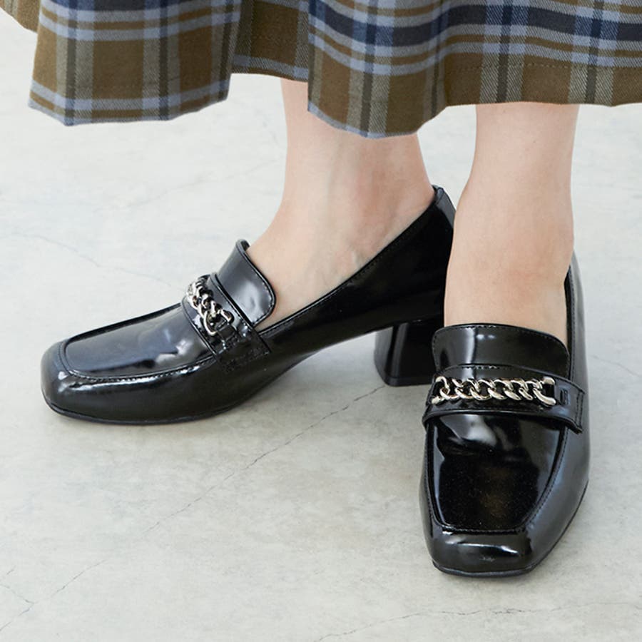 『ドラマティックなヒールがコーデを華やかに スクエアトゥチェーンモチーフ ローファーパンプス』