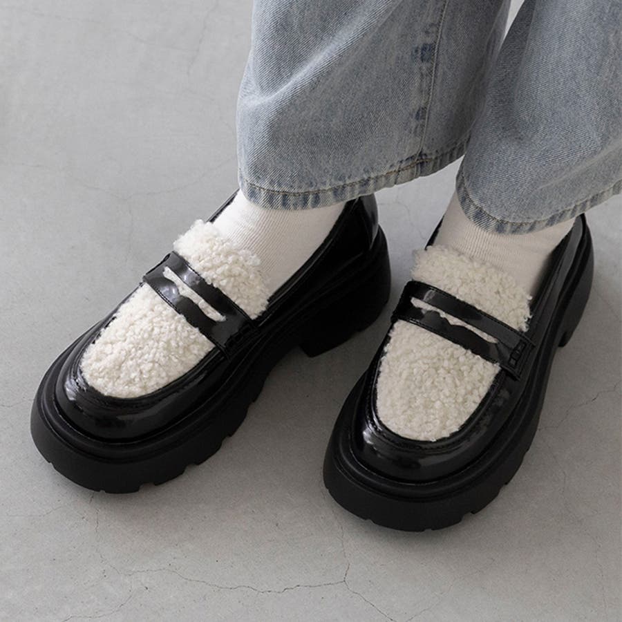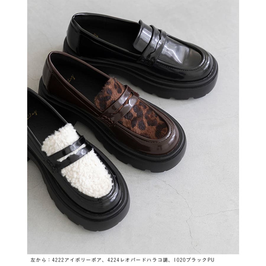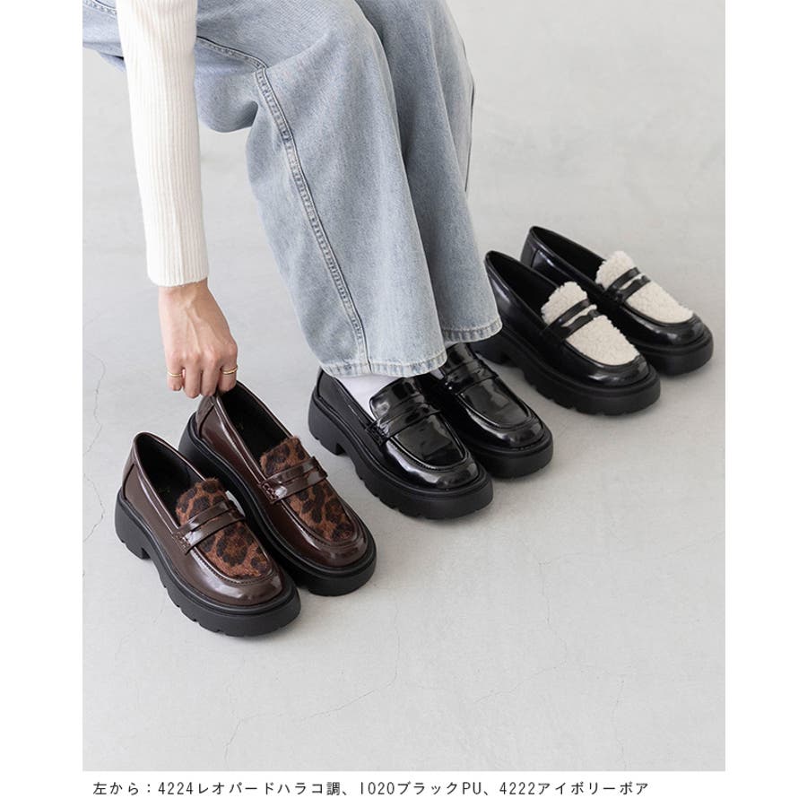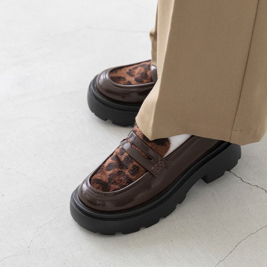 定番のコインローファーに、暖かなボア素材や旬のレオパード柄をあしらい、足元からトレンド感を演出。