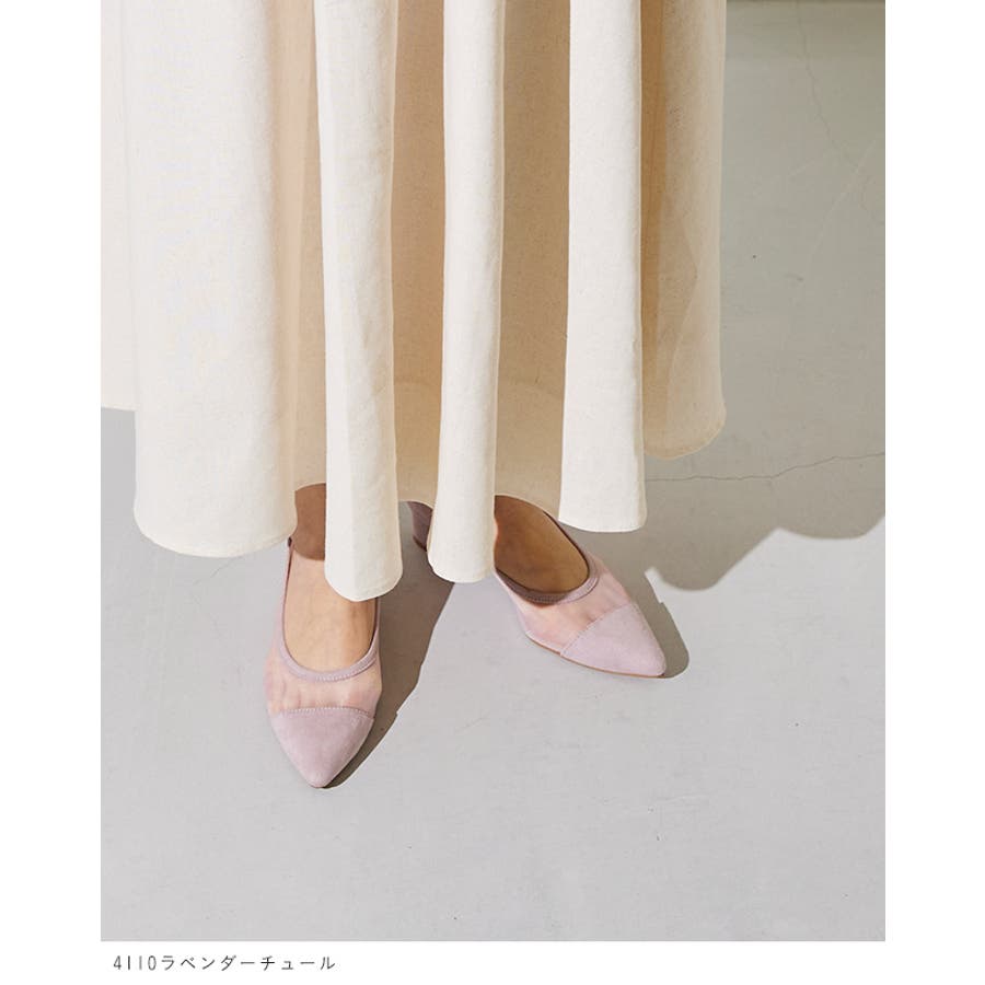 透け感あるチュール素材とやわらかなスエード素材の組み合わせが春夏にぴったり。