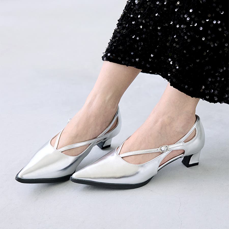 少しくびれた変形ヒールも合わさって、履くだけで大人の抜けコーデが完成します。