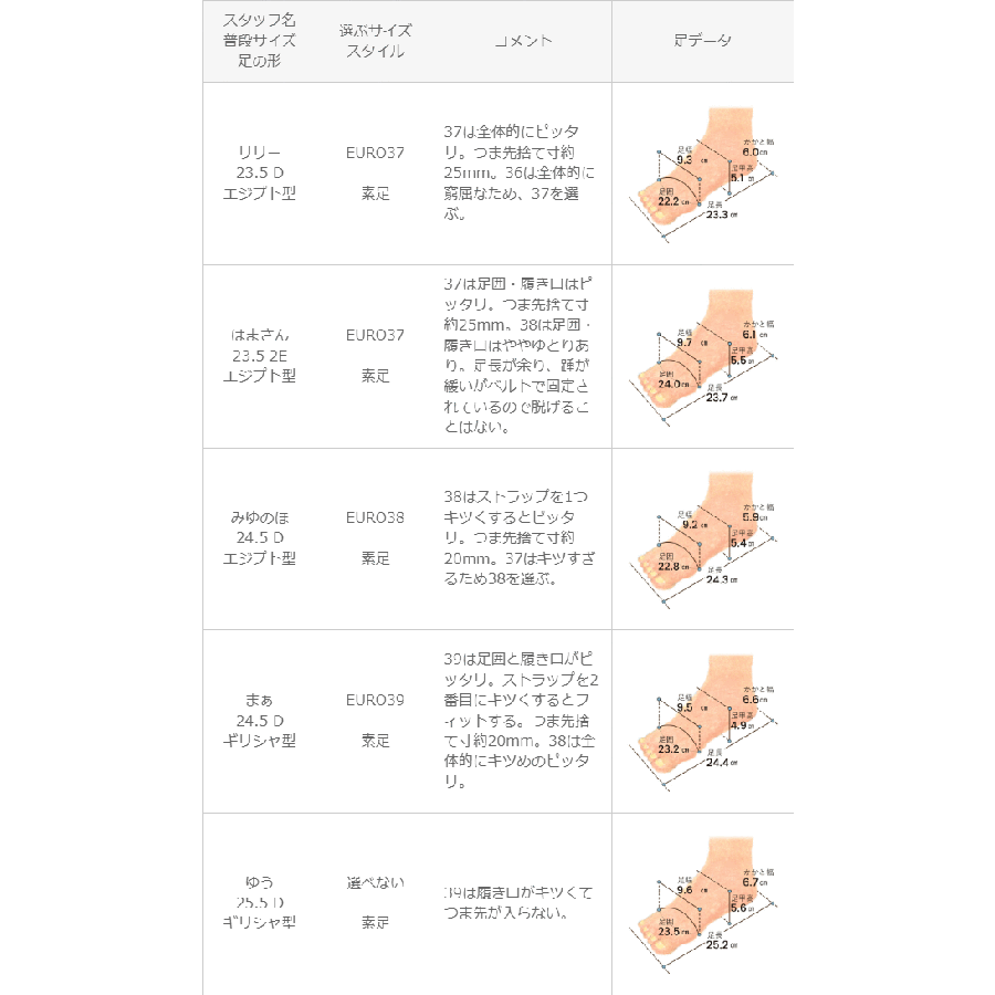 | 選ぶサイズ EURO36 | 36は全体的にピッタリ。ストラップの調整の必要なし。つま先捨て寸約20mm。37は足長と履き口が緩いので36を選ぶ。 |