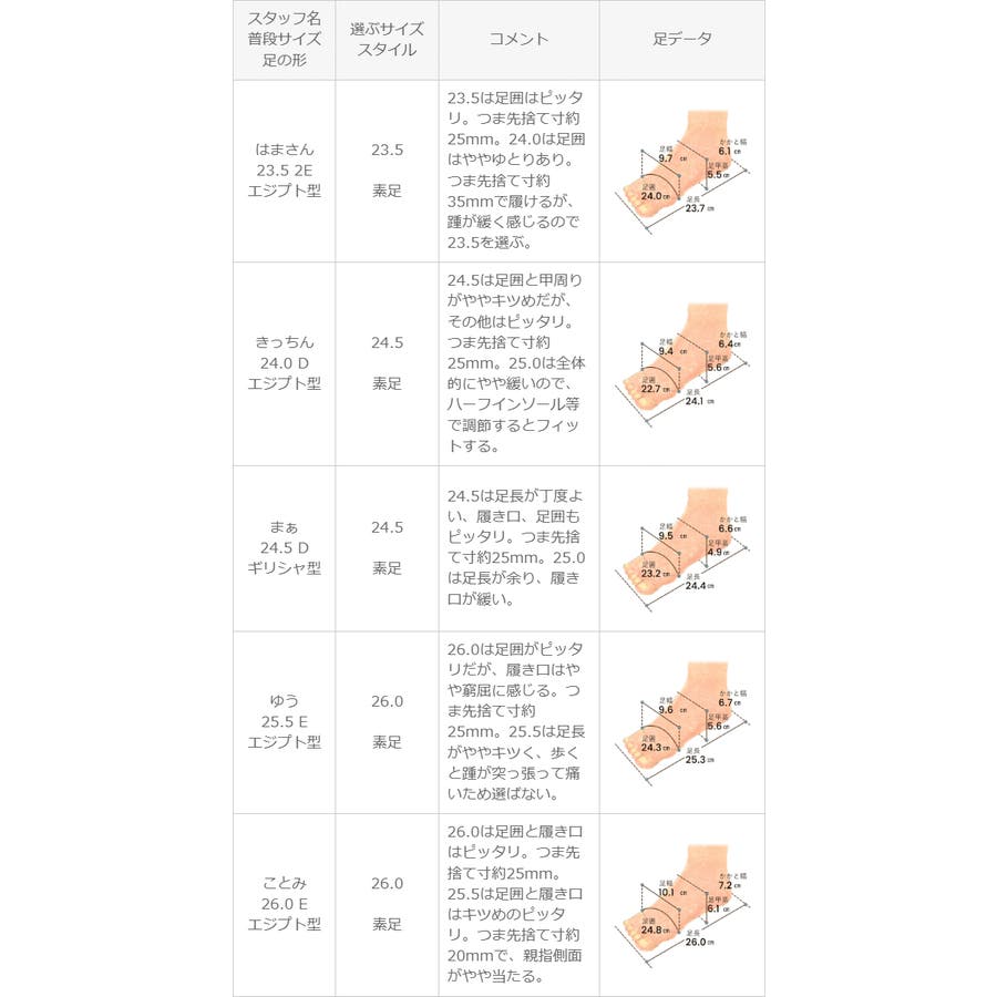 | 選ぶサイズ 24.5 | 24.5は足囲と甲周りがややキツめだが、その他はピッタリ。つま先捨て寸約25mm。25.0は全体的にやや緩いので、ハーフインソール等で調節するとフィットする。 |