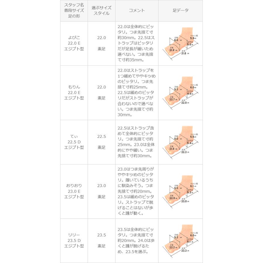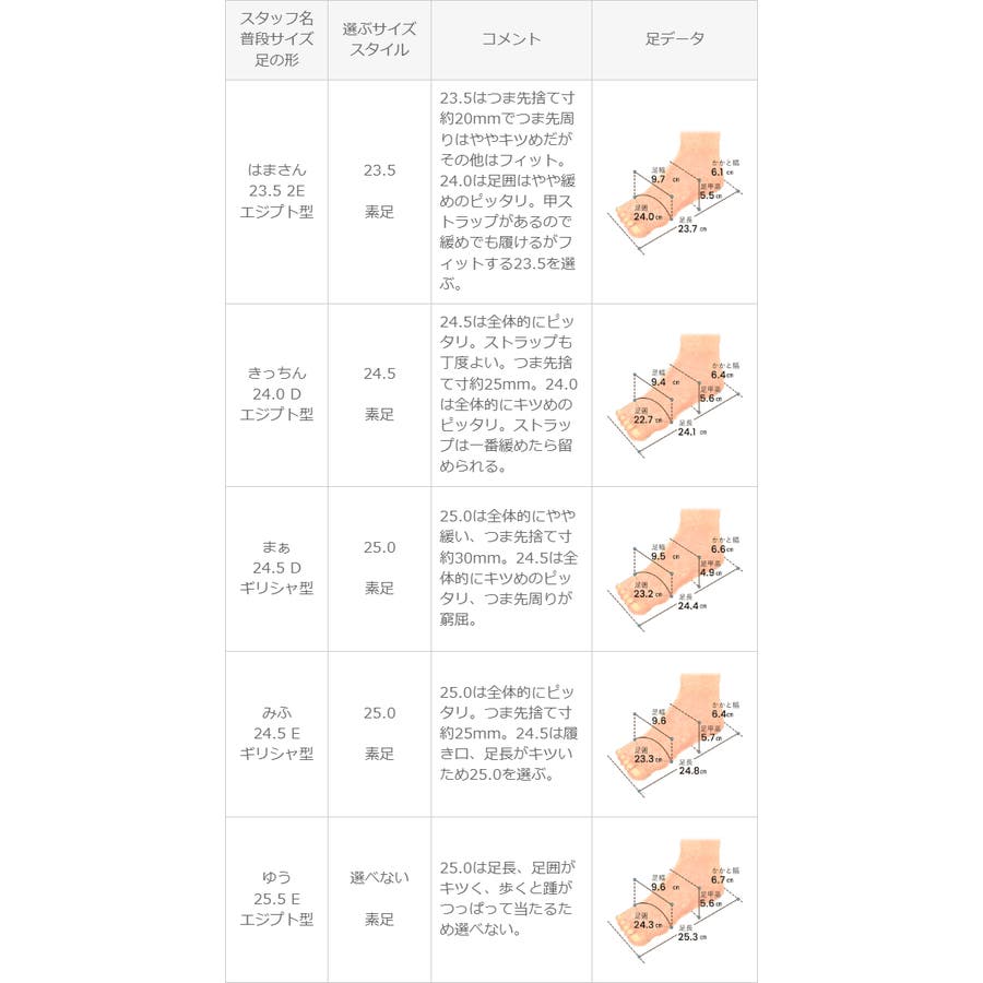 | 選ぶサイズ 23.5 | 23.5はつま先捨て寸約20mmでつま先周りはややキツめだがその他はフィット。24.0は足囲はやや緩めのピッタリ。甲ストラップがあるので緩めでも履けるがフィットする23.5を選ぶ。 |