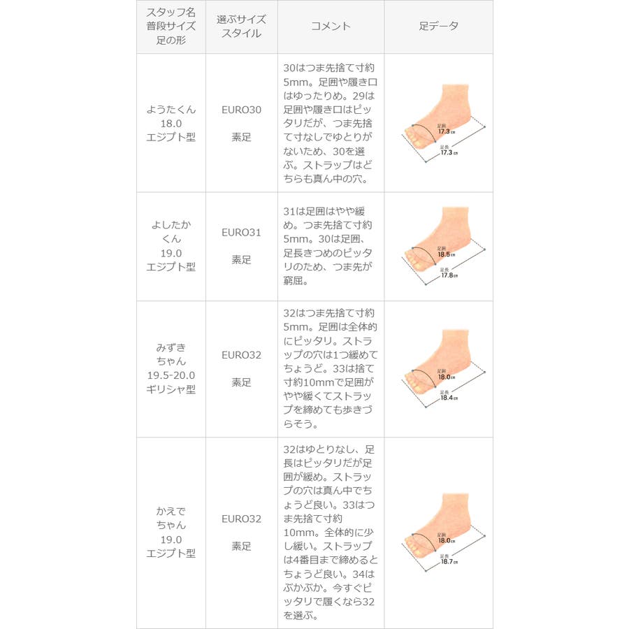 | 選ぶサイズ EURO31 | 31は足囲はやや緩め。つま先捨て寸約5mm。30は足囲、足長きつめのピッタリのため、つま先が窮屈。 |