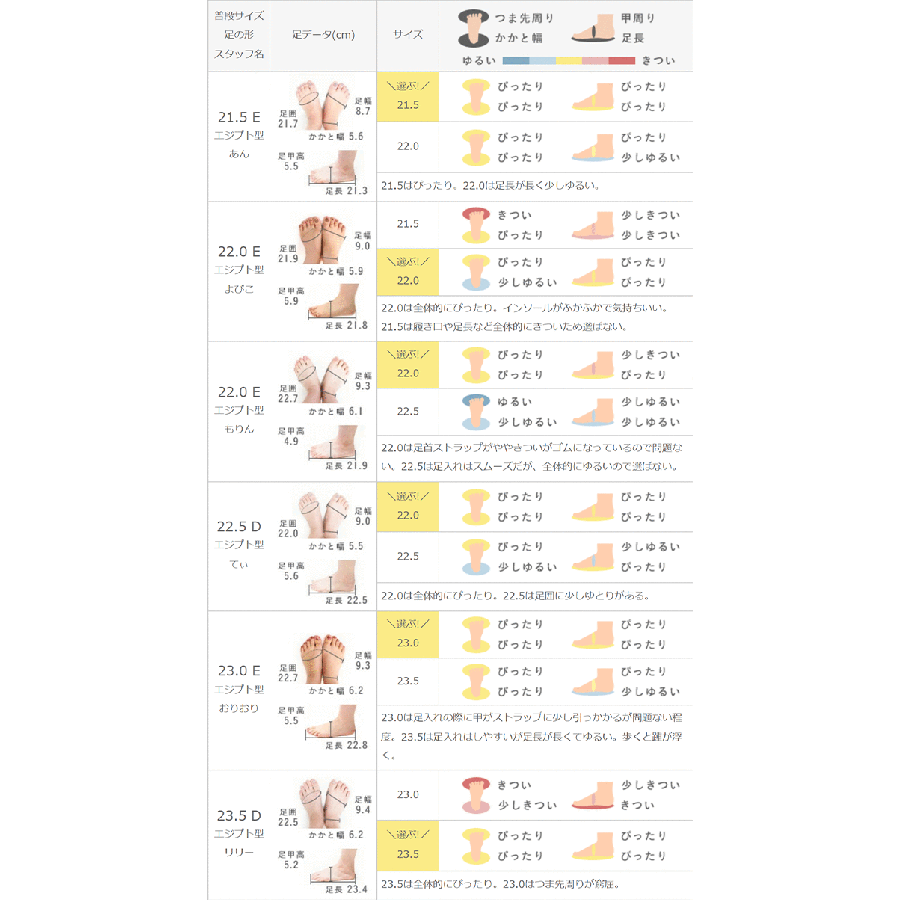 22.0は足首ストラップがややきついがゴムになっているので問題ない。22.5は足入れはスムーズだが、全体的にゆるいので選ばない。