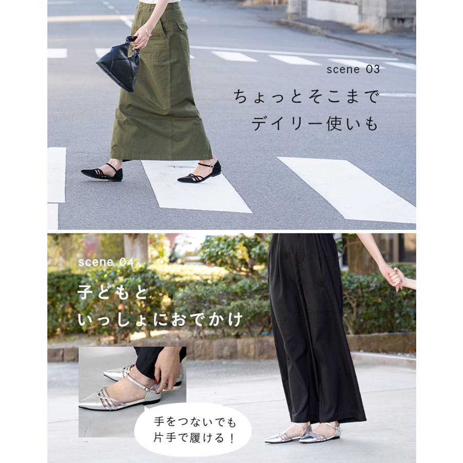 細身のアンクルストラップは付根がゴムになっているから、忙しい時にも片手で引っ張ってサッと履けます。