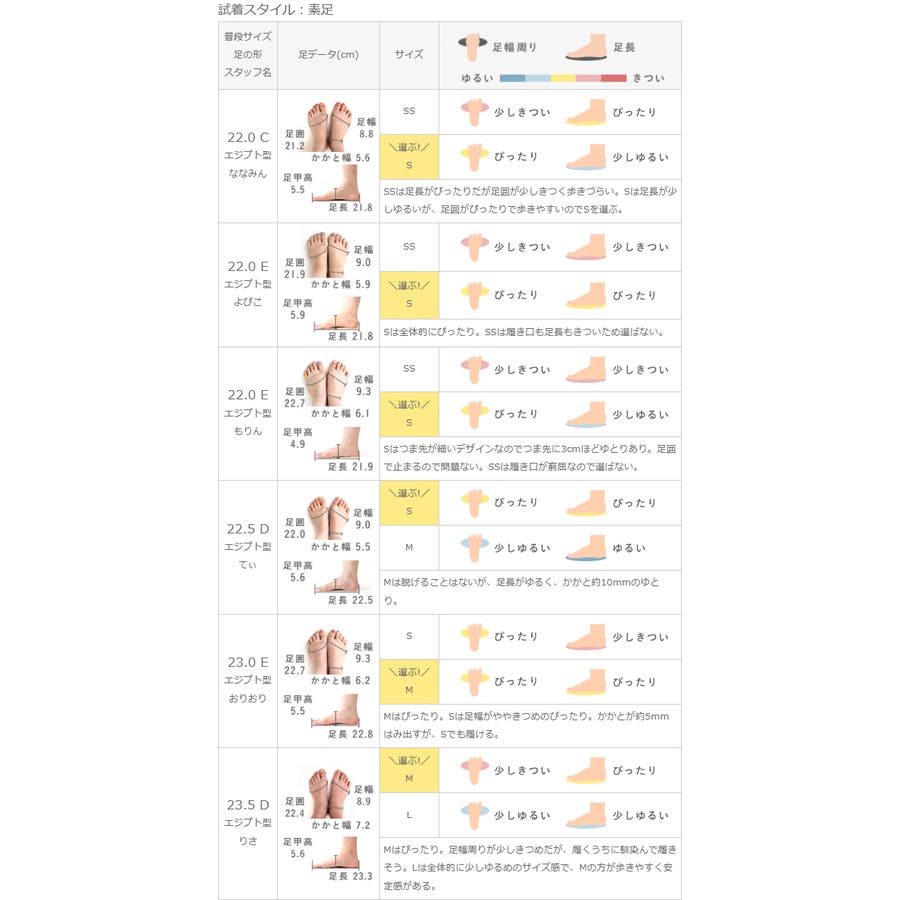 | サイズ | SS(21.0~21.5cm) / S(22.0~22.5cm) / M(23.0~23.5cm) / L(24.0~24.5cm) / LL(25.0~25.5cm) / 3L(26.0cm) |