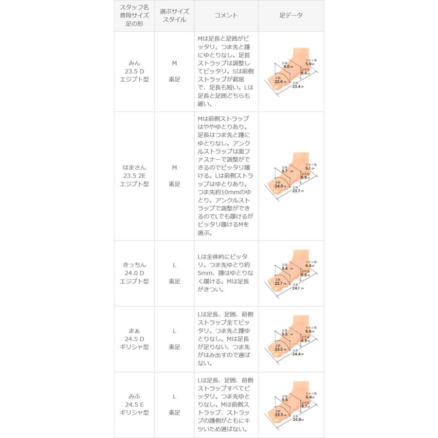 | 選ぶサイズ M | Mは前側ストラップはややゆとりあり。足長はつま先と踵にゆとりなし。アンクルストラップは面ファスナーで調整ができるのでピッタリ履ける。Lは前側ストラップはゆとりあり。つま先約10mmのゆとり。アンクルストラップで調整ができるのでLでも履けるがピッタリ履けるMを選ぶ。 |
