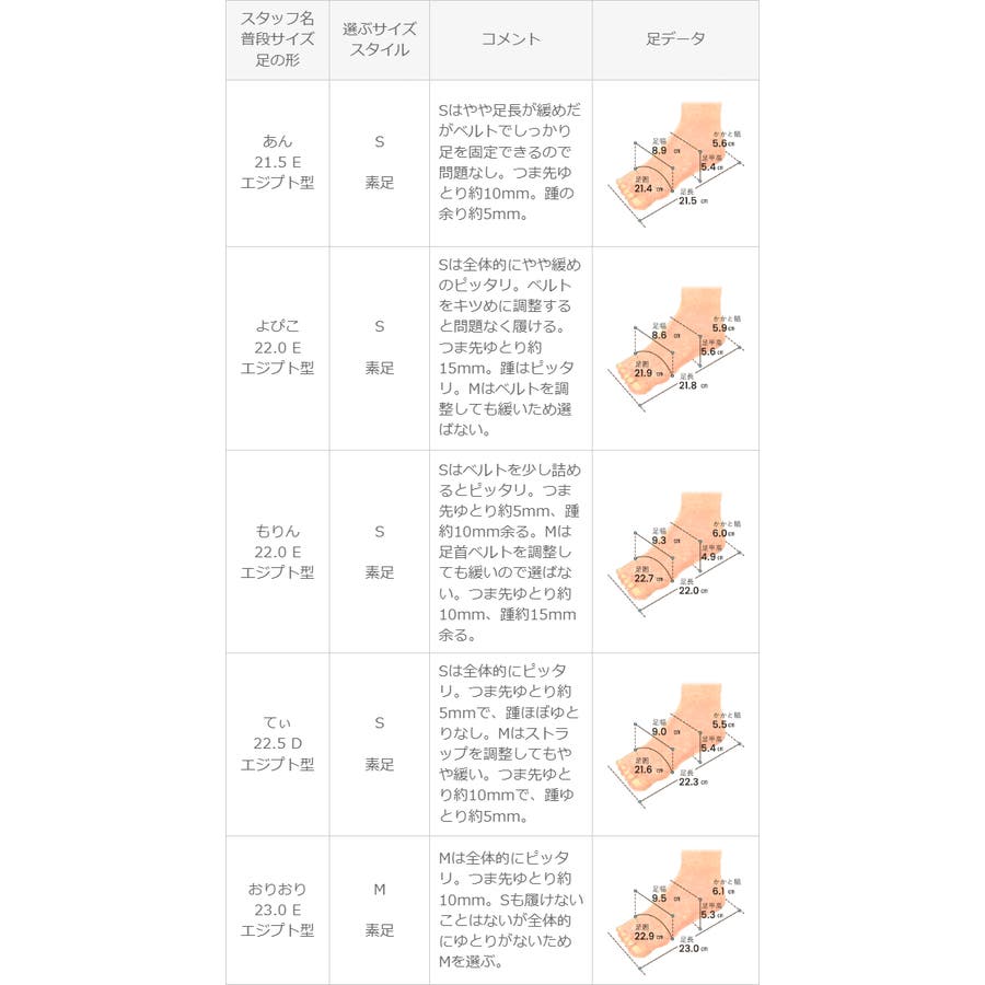 | サイズ | S(22.0~22.5cm) / M(23.0~23.5cm) / L(24.0~24.5cm) / LL(25.0~25.5cm) / LLL(26.0~26.5cm) |