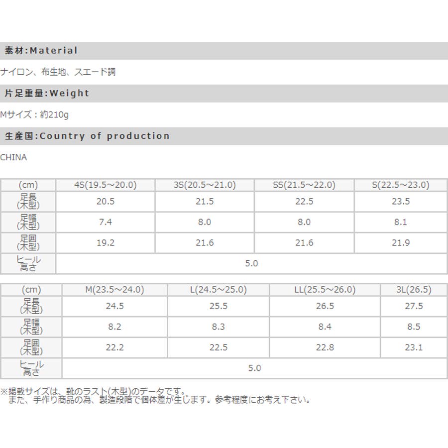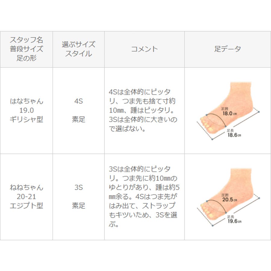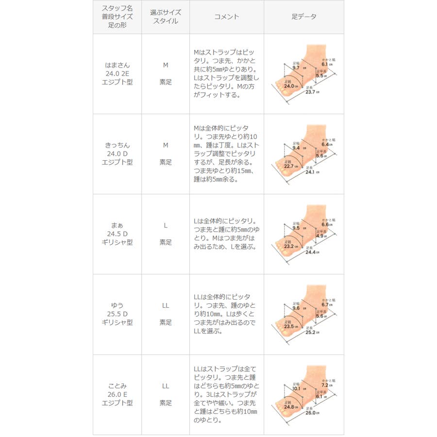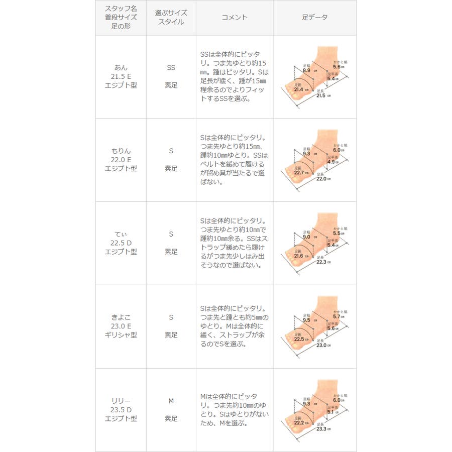| サイズ | SS(21.5~22.0cm) / S(22.5~23.0cm) / M(23.5~24.0cm) / L(24.5~25.0cm) / LL(25.5~26.0cm) / LLL(26.5cm相当) / SSS(20.5~21.0cm) / 4S(19.5~20.0cm) |