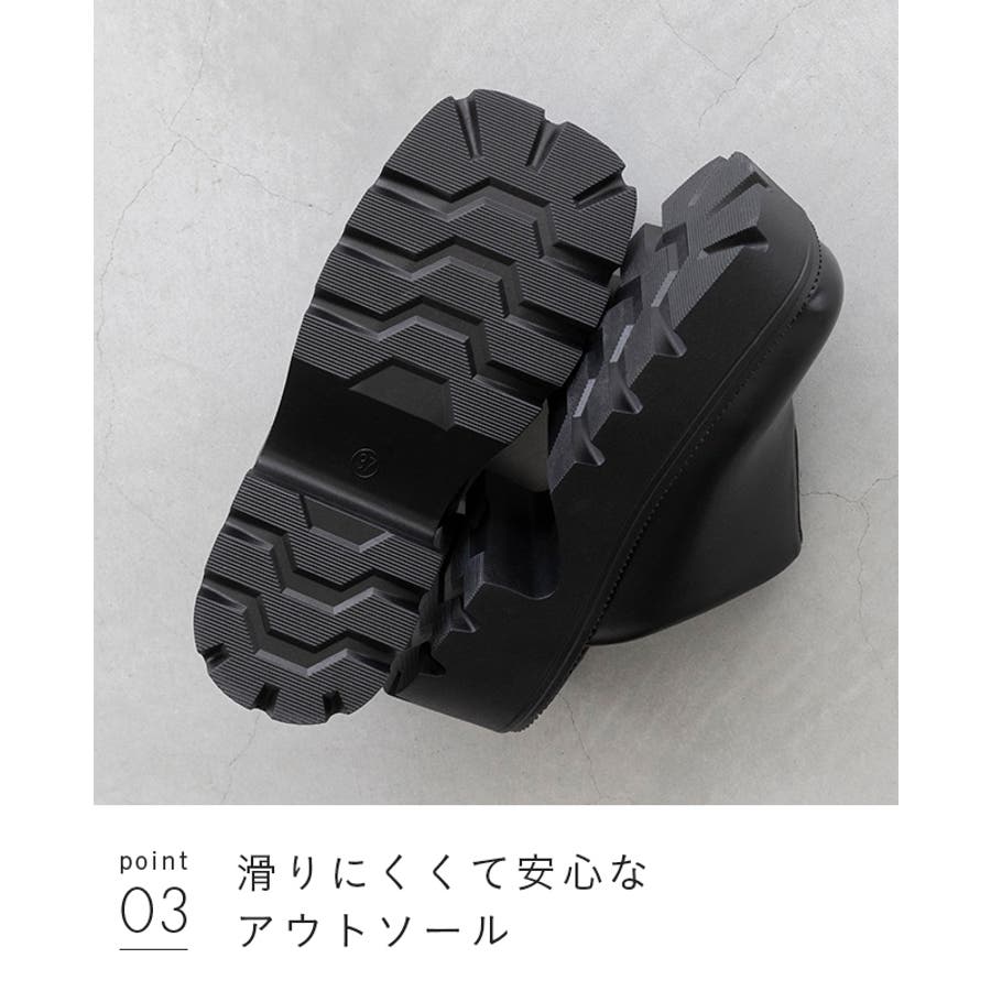 摩擦力の高い合成ゴムソールを使用。さらに、ゴツゴツした凹凸が地面をしっかり捉えて滑りにくくて安心。