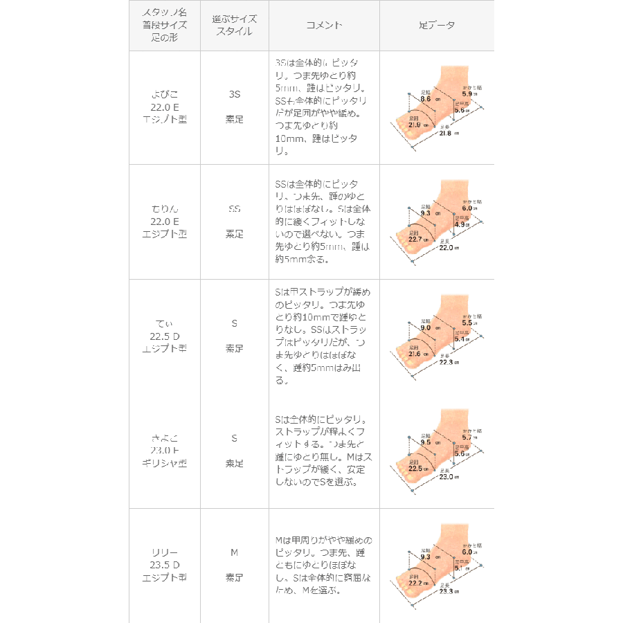 | サイズ | SSS(21.5~22.0cm) / SS(22.5相当) / S(23.0相当) / M(23.5~24.0cm) / L(24.5相当) / LL(25.0相当) / LLL(25.5相当) |