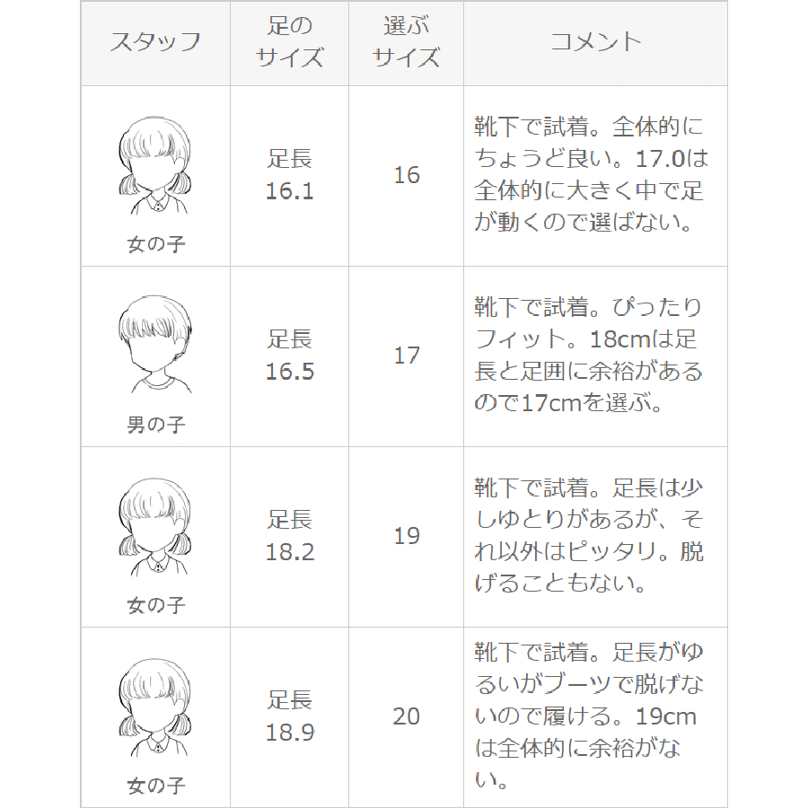 | 選ぶサイズ 19cm | 靴下で試着。足長は少しゆとりがあるが、それ以外はピッタリ。脱げることもない。 |