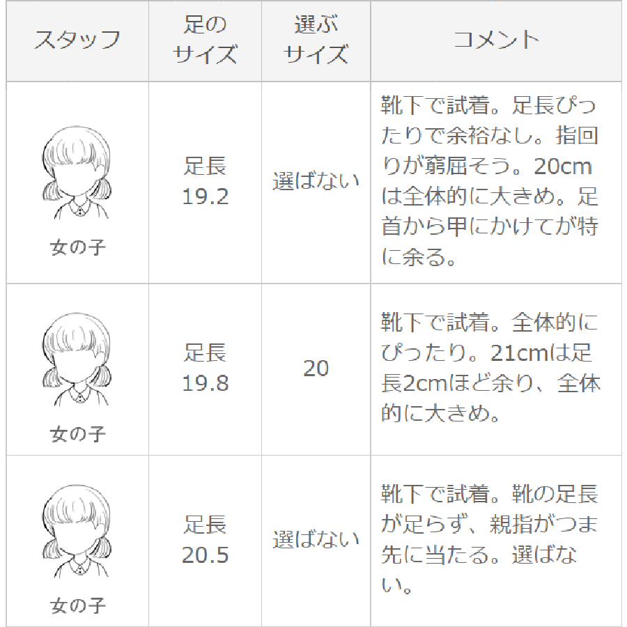 | 選ぶサイズ 20cm | 靴下で試着。全体的にぴったり。21cmは足長2cmほど余り、全体的に大きめ。 |