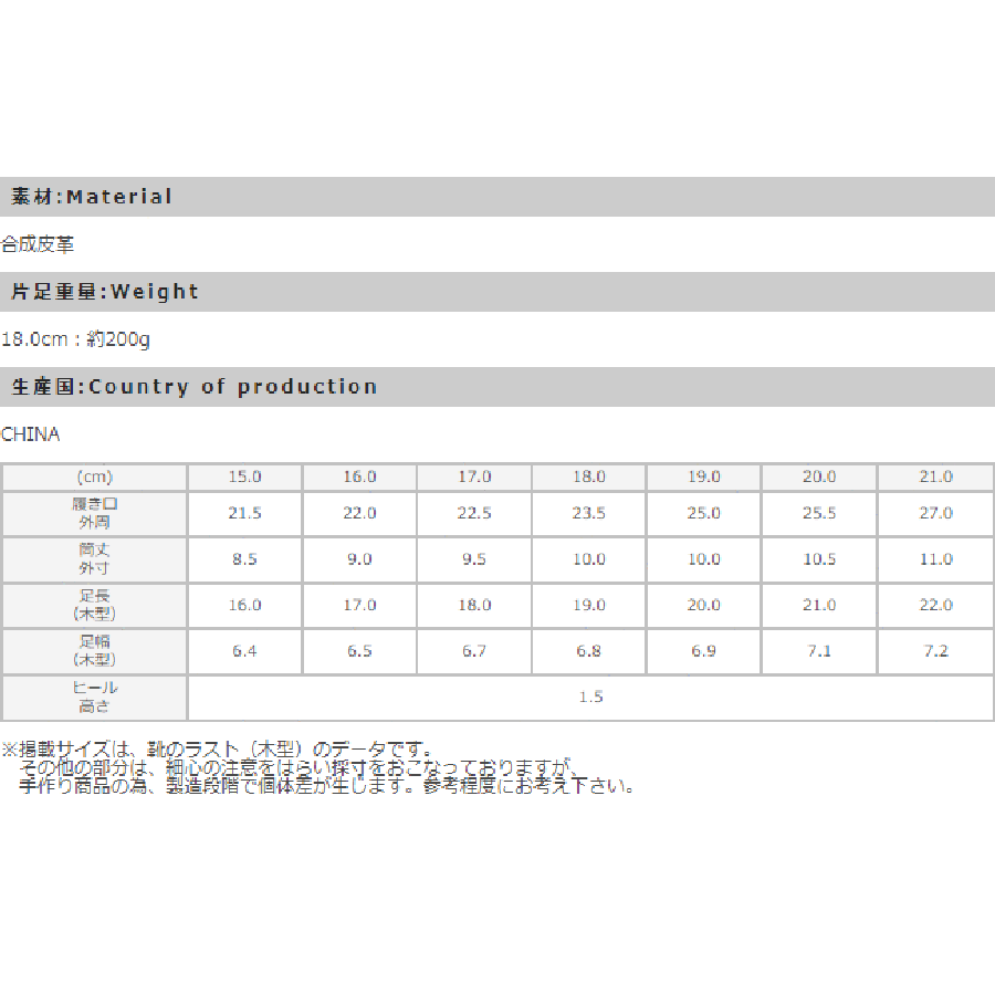 | サイズ | 15.0cm / 16.0cm / 17.0cm / 18.0cm / 19.0cm / 20.0cm / 21.0cm |