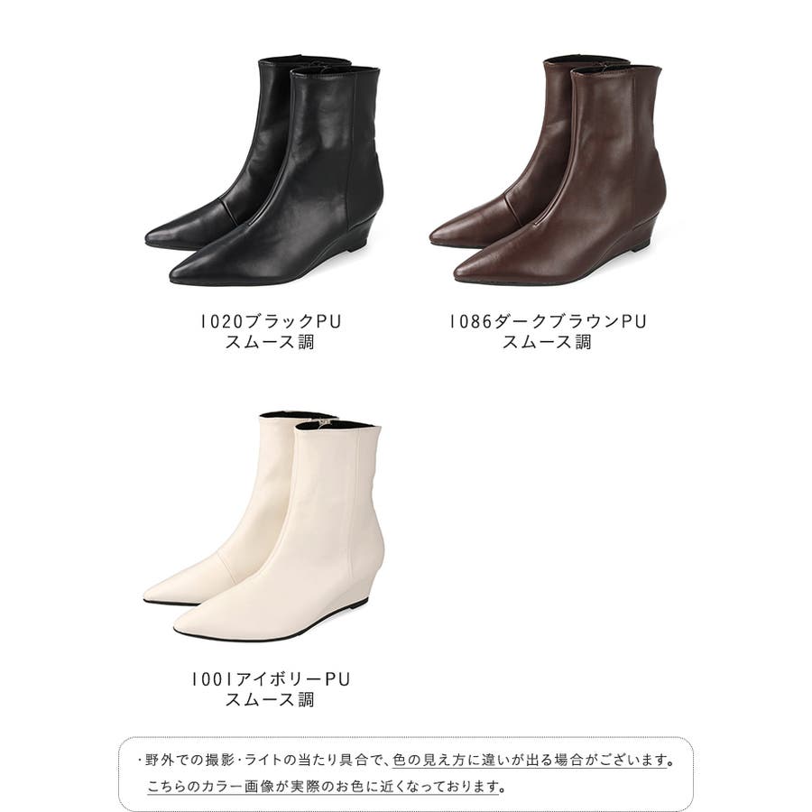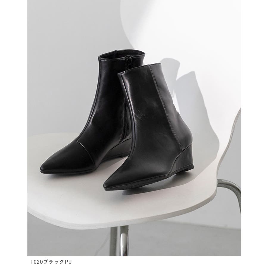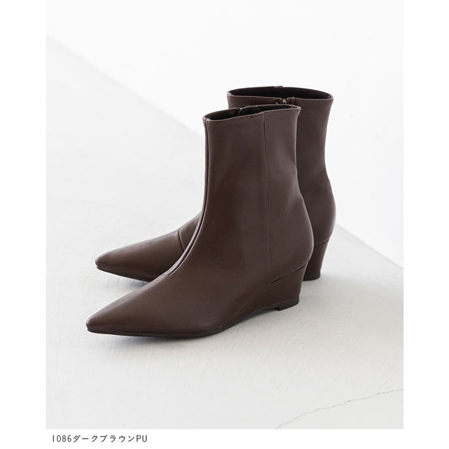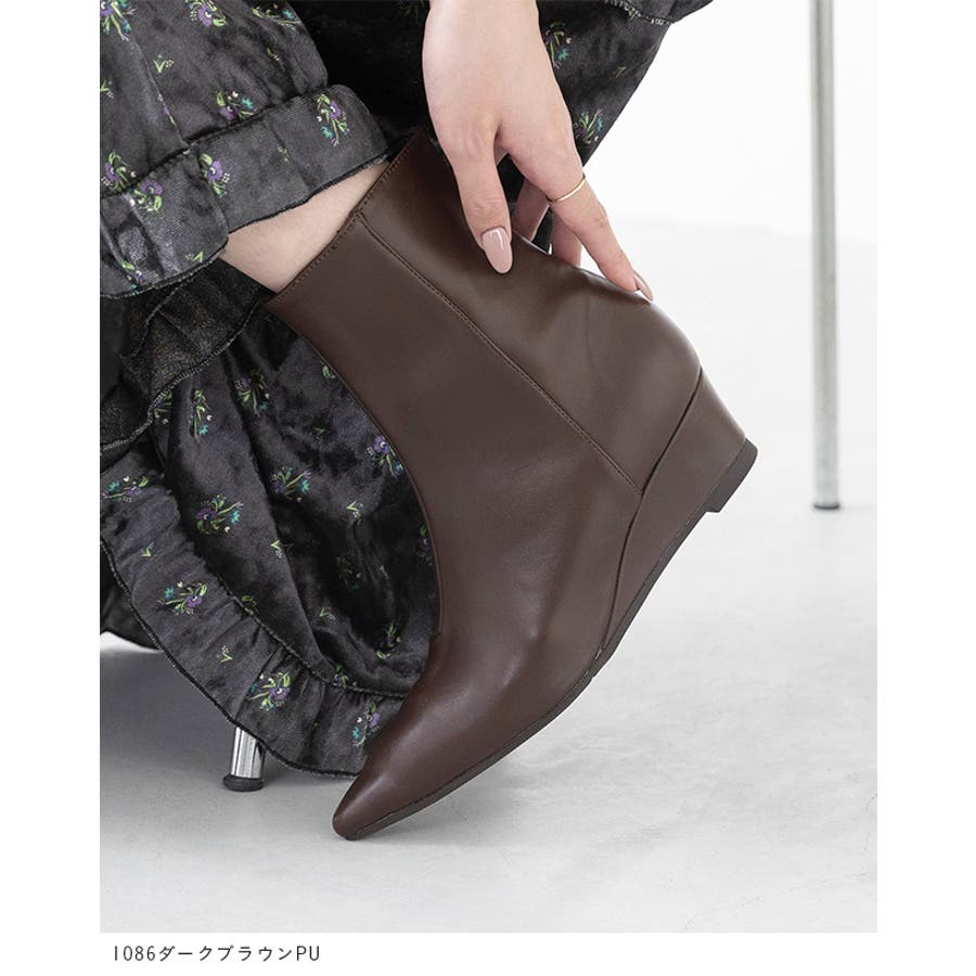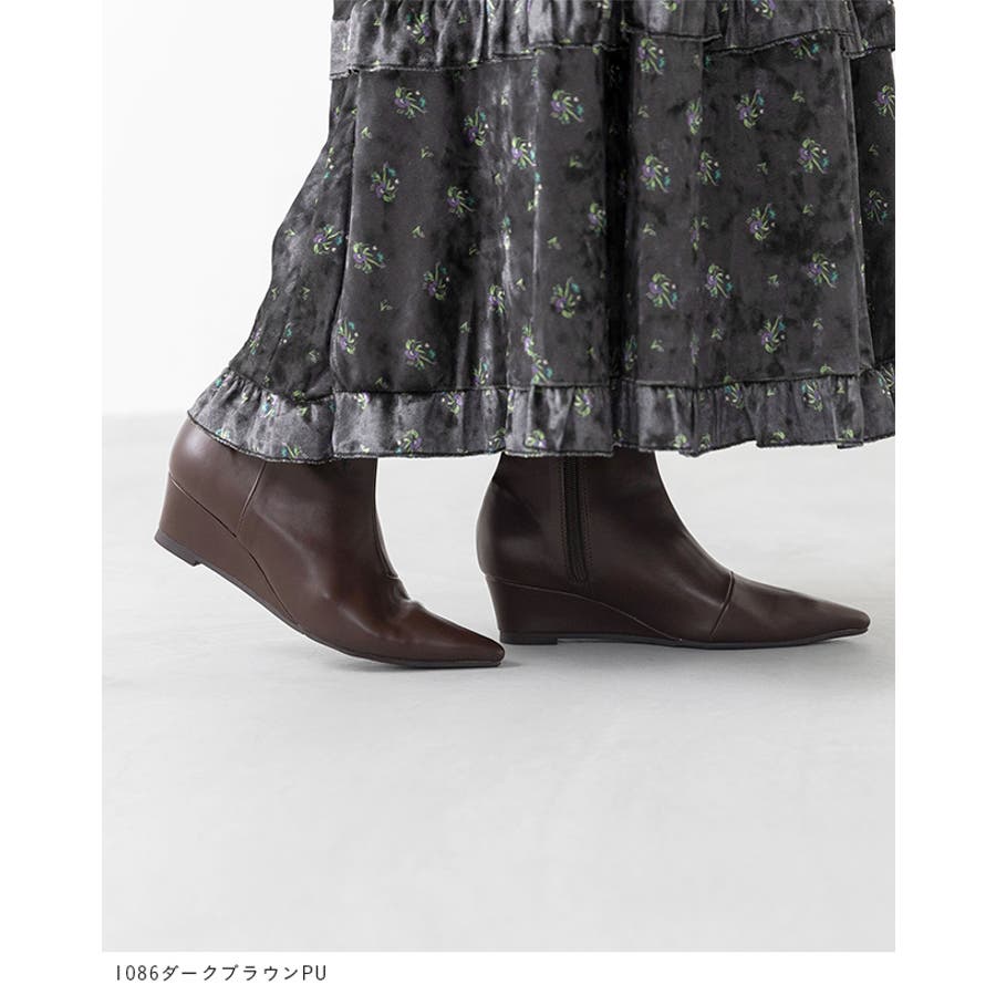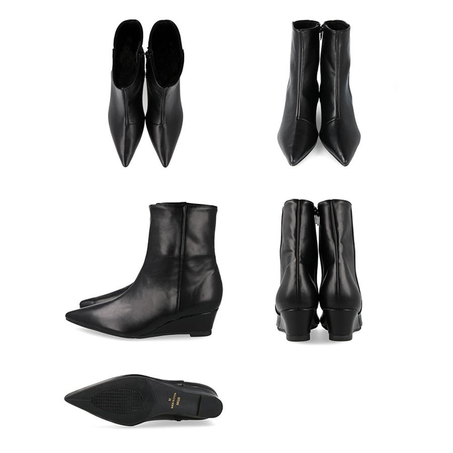 シャープなポインテッドトゥが足元をすっきりと見せ、洗練された印象に。さらに、安定感とデザイン性を両立させたウェッジヒールが、後ろ姿まで美しく彩ります。