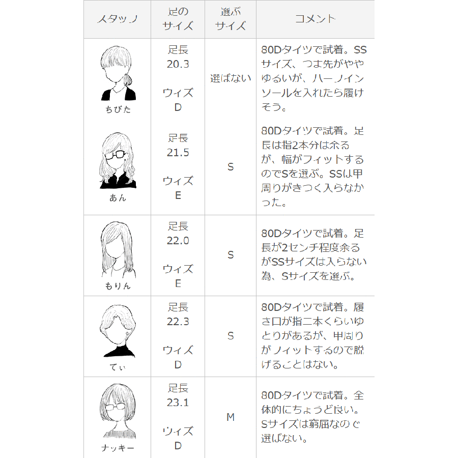 | 選ぶサイズ M | 80Dタイツで試着。全体的にちょうど良い。Sサイズは窮屈なので選ばない。 |