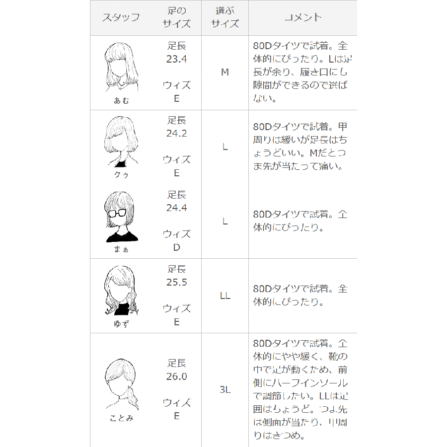 | 選ぶサイズ L | 80Dタイツで試着。甲周りは緩いが足長はちょうどいい。Mだとつま先が当たって痛い。 |