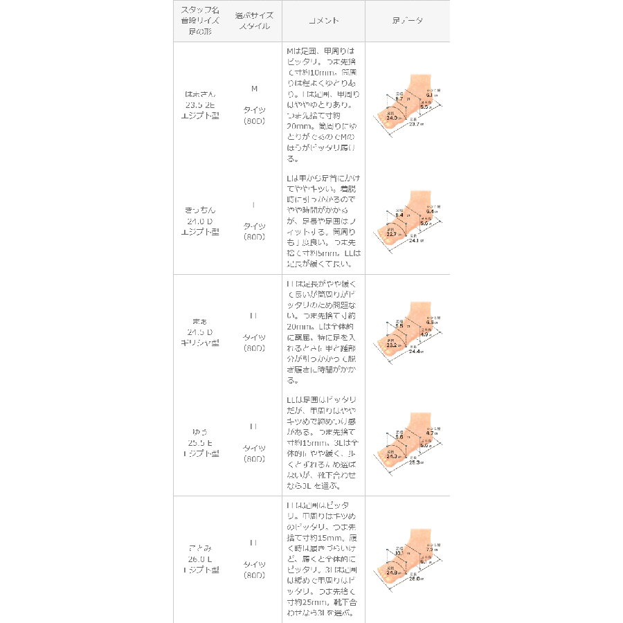 選ぶサイズ L | Lは甲から足首にかけてややキツい。着脱時に引っかかるのでやや時間がかかる。足長や足囲はフィットする。筒周りも丁度良い。つま先捨て寸約5mm。LLは足長が緩い。 |