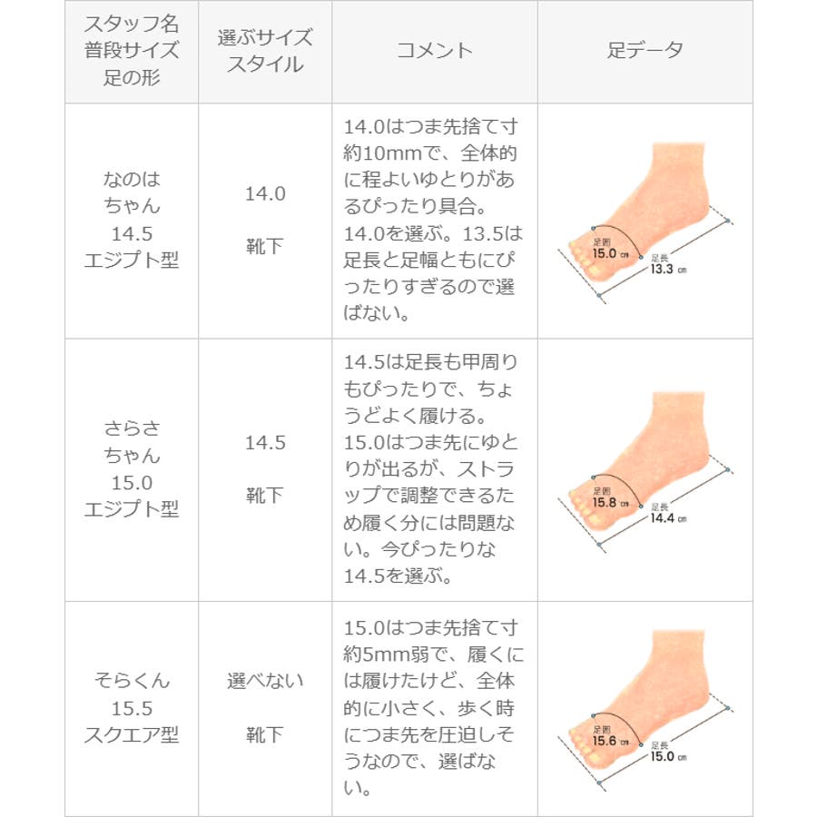 | 選ぶサイズ 14.5 | 14.5は足長も甲周りもぴったりで、ちょうどよく履ける。15.0はつま先にゆとりが出るが、ストラップで調整できるため履く分には問題ない。今ぴったりな14.5を選ぶ。 |