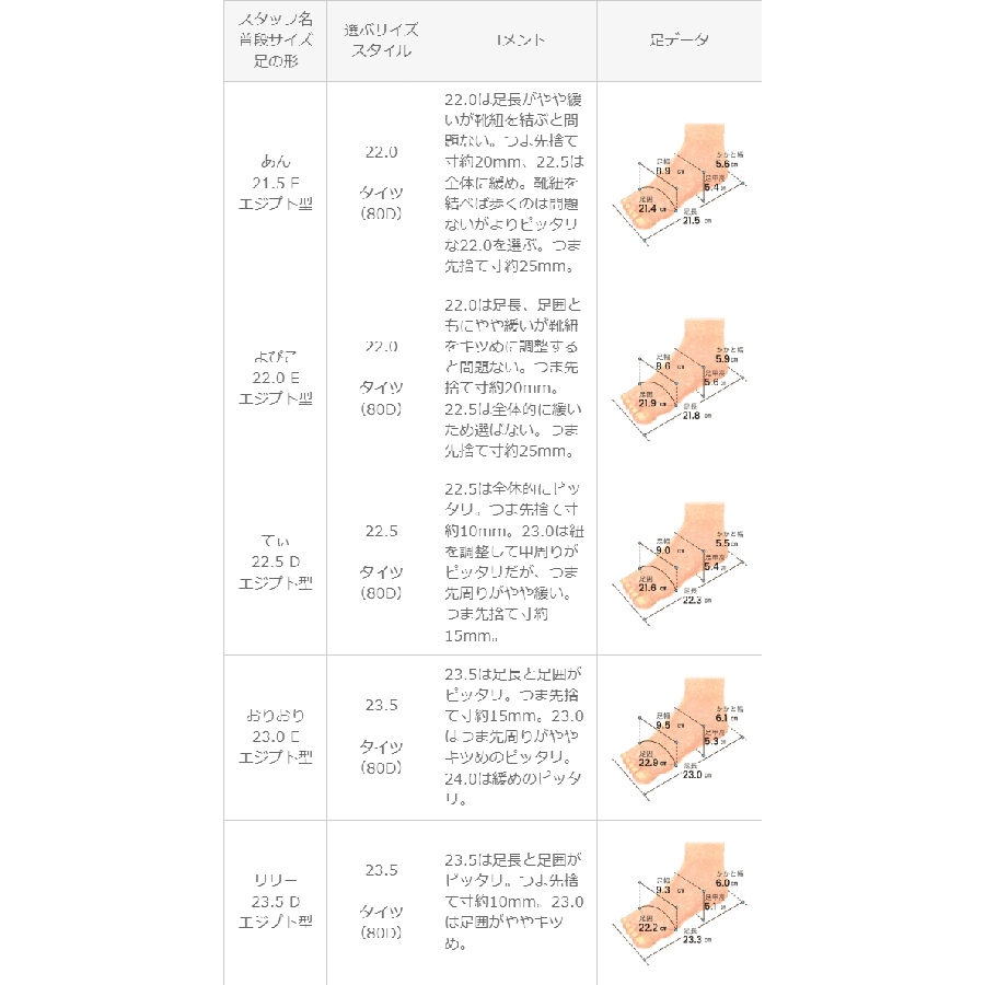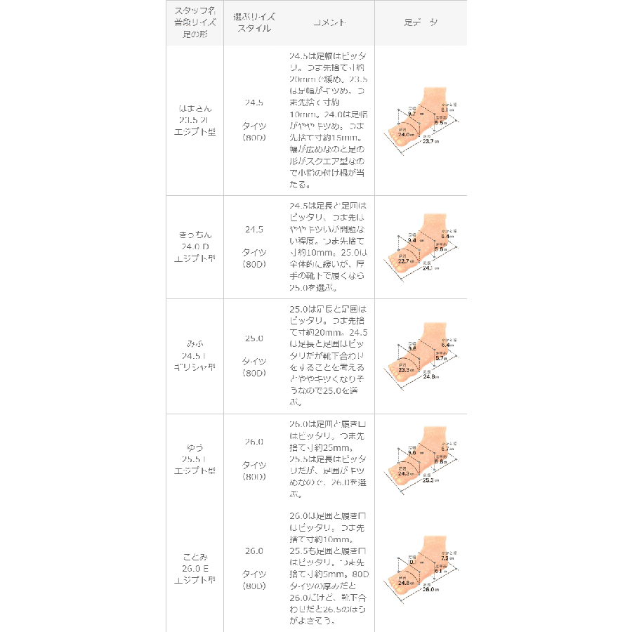 | 選ぶサイズ 24.5 | 24.5は足幅はピッタリ。つま先捨て寸約20mmで緩め。23.5は足幅がキツめ。つま先捨て寸約10mm。24.0は足幅がややキツめ。つま先捨て寸約15mm。幅が広めなのと足の形がスクエア型なので小指の付け根が当たる。 |