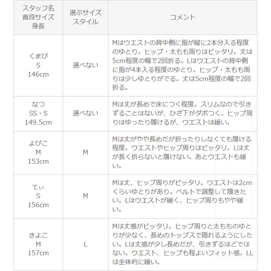 | 選ぶサイズ M | Mは丈、ヒップ周りがピッタリ。ウエストは2cmくらいゆとりがあり。ベルトで調整して履きたい。Lはウエストが緩く、ヒップ周りもやや緩い。 |