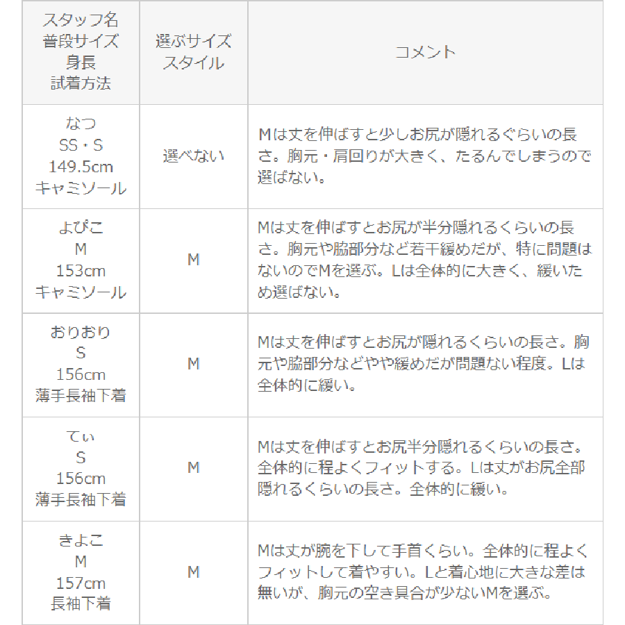 選ぶサイズ M | Mは丈を伸ばすとお尻が半分隠れるくらいの長さ。胸元や脇部分など若干緩めだが、特に問題はないのでMを選ぶ。Lは全体的に大きく、緩いため選ばない。 |