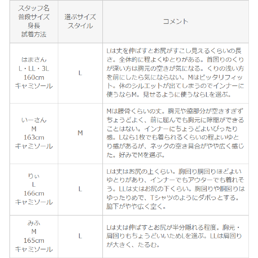 選ぶサイズ L | Lは丈を伸ばすとお尻がすこし見えるくらいの長さ。全体的に程よくゆとりがある。首回りのくりが深い方は胸元の空きが気になる。くりの浅い方を前にしたら気にならない。Mはピッタリフィット。体のシルエットが出てしまうのでインナーに使うならM。見せるように使うならLを選ぶ。 |